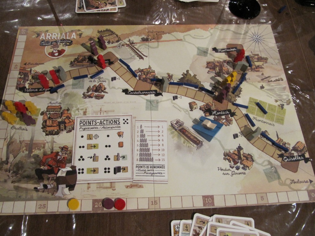 J’ai vraiment accroché à notre première partie d’Arriala. On réfléchi, on s’amuse, on se prend pas trop la tête… Visiblement pas assez dans mon cas! J’ai commencé par bloquer mes travailleurs dans les vignes, alors qu’il ne faut obtenir des majorités qu’à la fin de la partie ;-( et pas bien compris l’importance des cartes, primordiale ici! Les cartes apportent aussi une variété dans les approches possibles.