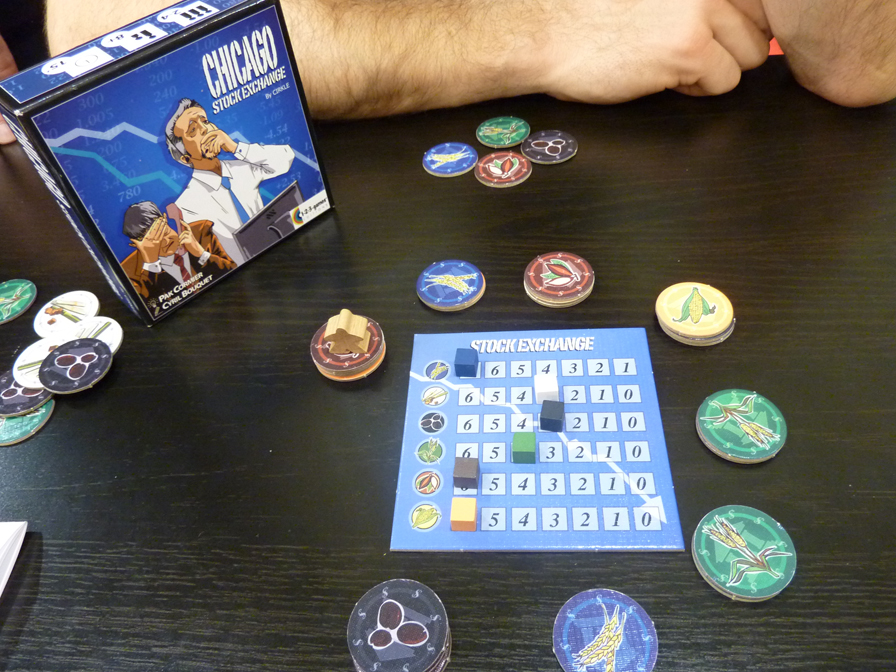 Chicago Stock Exchange se compose de jeton représentant des commodités. Il y en a 6 et chacune possèdent plusieurs jetons. Tous ces jetons sont divisés en 9 piles (si je ne me trompe pas) de 4, aléatoirement. Il y a donc 9 jetons visibles au début de la partie.