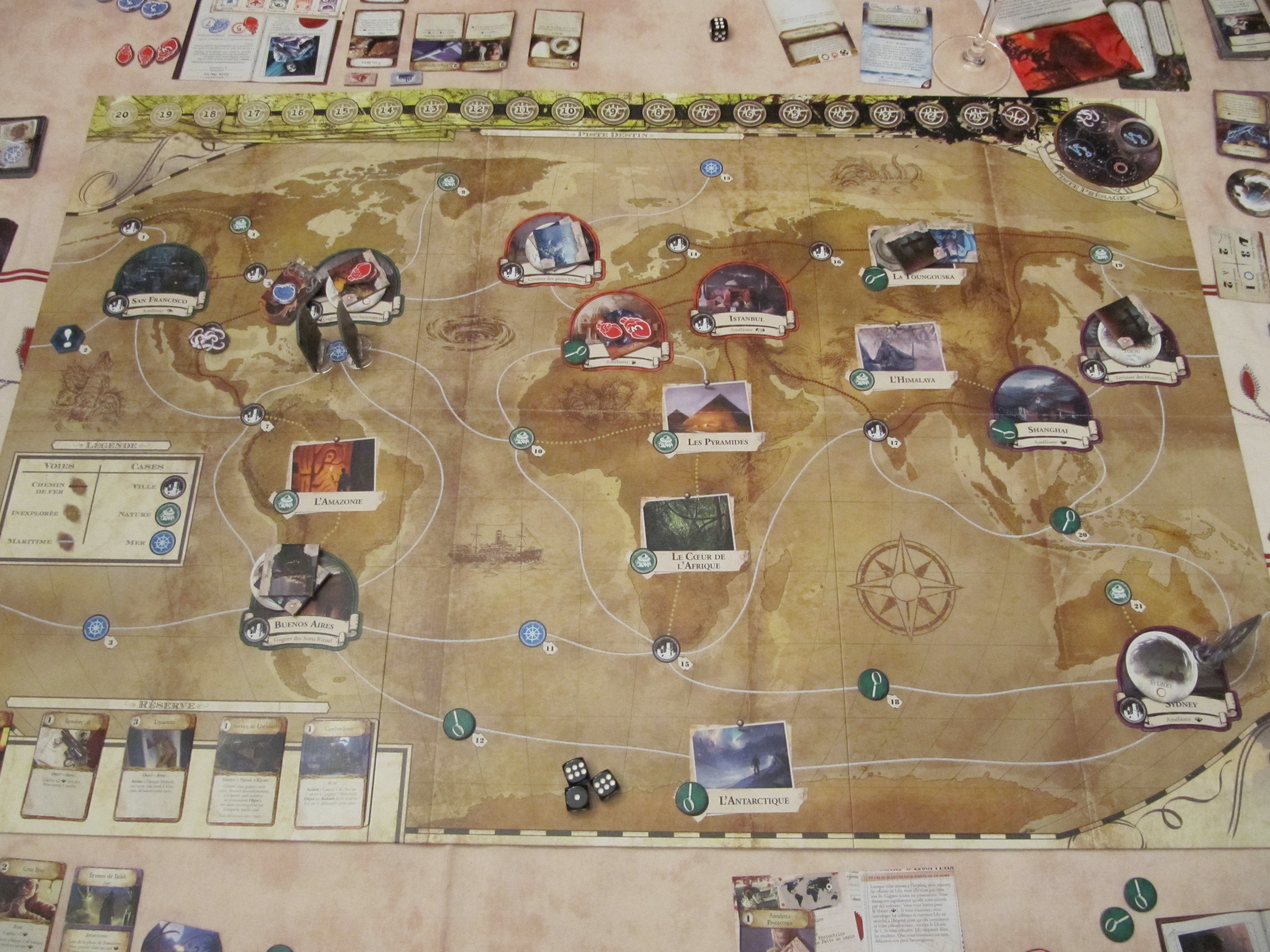 Les Contrées de l’Horreur est un jeu collaboratif basé sur la mécanique des choix d’action. En effet, chacun à son tour peut exécuter 2 actions parmi voyager (= bouger d’un endroit à un autre), se reposer (gagner des points de vie et de santé mentale), recevoir des billets de transport pour voyager plus loin, acheter des objets ou échanger ses objets avec un autre investigateur situé sur la même case. Les choix sont assez évidents et cette phase est assez simple. Les seules décisions prises par les joueurs consistent à déterminer l’endroit où chaque joueur doit se trouver. Et encore, c’est pas trop compliqué, il faut se répartir la tâche entre résoudre le mystère en cours (3 mystères ou 4 résolus et c’est gagné) ou combattre des monstres pour fermer des portails ou pour empêcher le marqueur temps d’avancer.
