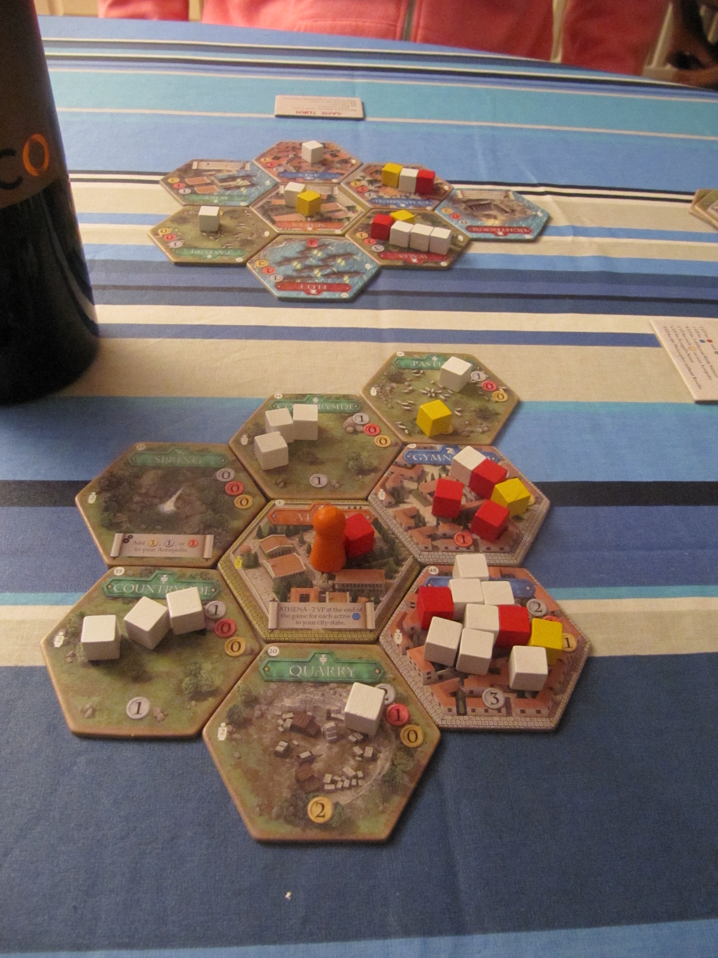 – Attaquer une tuile d’une cité adverse.  Les combats sont assez étonnants et sans une once de hasard.  Ils se déroulent un peu comme la construction de tuile (cfr point c plus haut).  Vous prenez, de vos tuiles, une combinaison de cubes blancs (= citoyens = 1 point d’attaque) et rouges (= soldats = 2 points d’attaque).  Tout comme expliqué dans le point c-, ce retrait de cubes est délicat car il peut engendrer de désactiver certaines tuiles les rendant indisponibles pour la production.