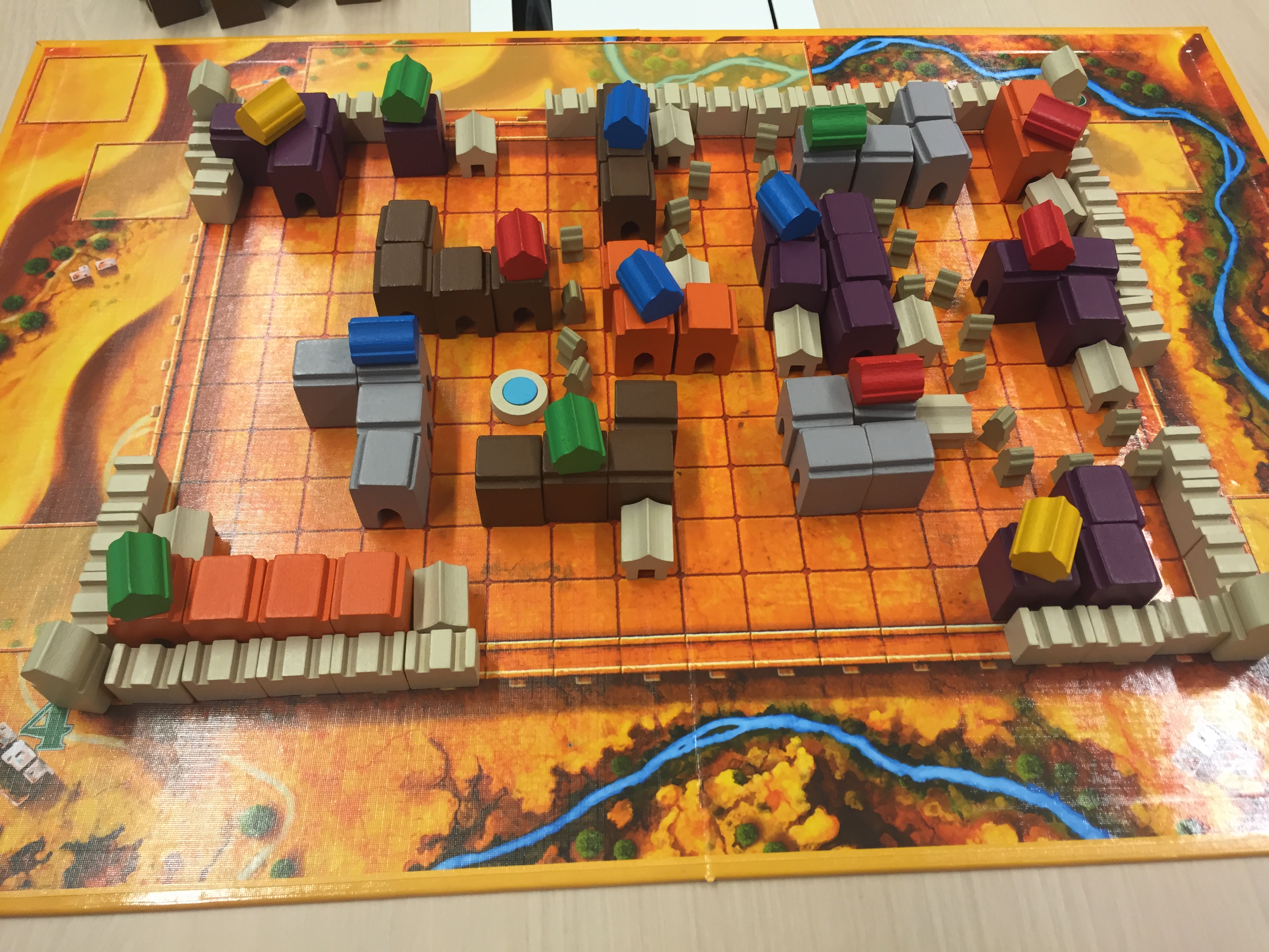 Bon, tout n’est pas meilleur. Le matériel en bois est toujours aussi beau et légèrement amélioré : les bâtiments sont plus fins, les remparts sont mieux travaillés et ressemblent encore plus à des remparts et les marchands sont mieux découpés. Il y a cependant quelques petits soucis de couleurs qui gênent très peu le jeu en soi mais dont on aurait aimé pouvoir se passer : la couleur des tuiles bonus ne correspond pas bien à la couleur des bâtiments et la couleur des bâtiments sur les feuillets de scores n’est pas conforme non plus. Ca apporte un peu de confusion mais ce n’est pas insurmontable 😉 Le second élément un peu dommage est la qualité du plateau qui brille un peu trop fort. A l’heure actuelle, les éditeurs font appels à de très bons illustrateurs et j’aurais aimé un plateau plus beau et plus immersif que l’original.