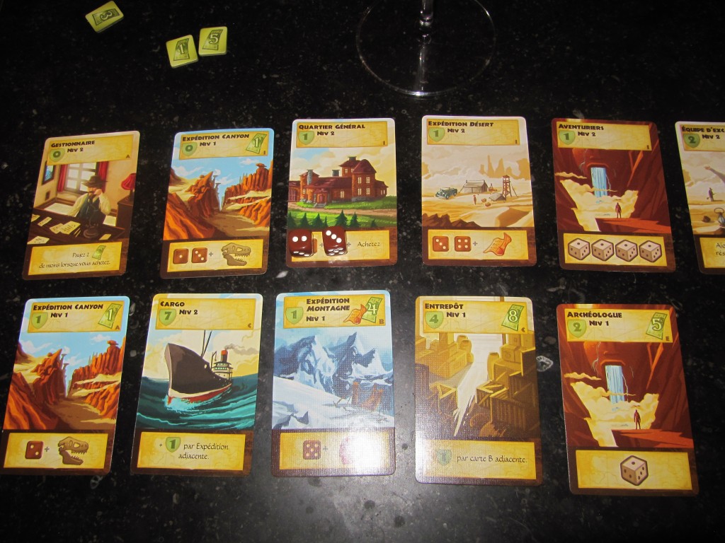 C’est d’autant plus dommage que le reste du jeu est très bon.  Plusieurs stratégies différentes sont possibles et la variété des cartes donne vraiment envie d’y jouer de nombreuses fois.  A l’exception de cette lenteur, Reliques & Co est tellement bien fait qu’il donne vraiment l’envie de créer des variantes permettant 1106 Reliques 2d’accélérer le rythme.  Permettre aux joueurs de lancer leurs dés en même temps, de planifier leurs actions en même temps puis de les résoudre en suivant l’ordre du tour pourrait peut-être améliorer la rapidité de la partie.  Un jeu plus fluide, avec la même variété de cartes, les mêmes stratégies différentes possibles et le même nombre impressionnant de choix en ferait un must buy absolu pour le prochain salon d’Essen 😉