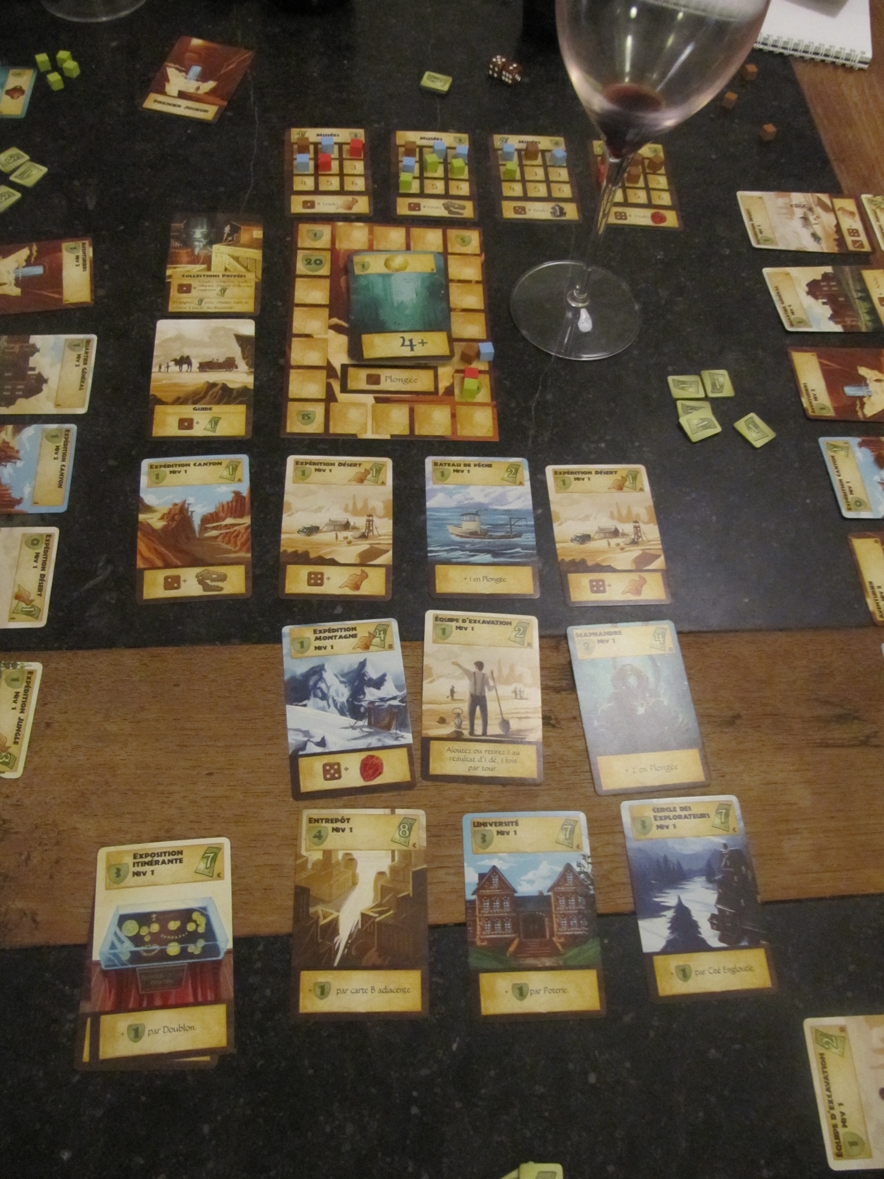 Verdict? Comme dit dans mon introduction je m’attendais à un étoilé, j’ai eu une honnête brasserie. Le jeu n’est pas mauvais, loin de là, il est même plus qu’honnête. La mécanique tourne bien, il y a plusieurs moyens de marquer des points et il y a de la compétition (pour acheter les cartes, pour les musées, éventuellement pour les plongées). Mais il y a plusieurs points qui ne sont pas à la hauteur des espérances: les illustrations, toujours réalisées par l’auteur, c’est à souligner, me parlent moins que celles d’un monde oublié que je trouvais splendides (d’où la notion d’attente déçue). C’est toujours très subjectif, mais voilà, je suis moins emballé, c’est la réalité et je dois vivre avec (c’est dur mais je vais m’en sortir). Le thème ne me dit rien, il ne me transporte pas dans un univers ou je peux m’immerger. Last but not least, le jeu est assez froid dans son déroulement. Ce n’est pas un « gros » jeu de stratégie, mais comme il est quand même assez calculatoire (« j’ai besoin de telle relique pour réaliser telle commande pour être majoritaire dans tel musée, donc je dois acheter telle carte avant lui, donc je dois d’abord vendre telle autre relique pour avoir assez d’argent ha non zut il vient d’acheter ma carte du coup je vais plutôt essayer d’être majoritaire dans tel autre musée du coup il me fait telle autre carte… ») le temps d’attente entre deux tours de jeu peut être assez long (vu que chez Vin d’jeu on ne veut pas se laisser humilier par ses camarades de débauche alcoolisée de jeu, donc on joue la gagne à donf, donc on réfléchit!). Bref on ne vit pas la partie intensément.