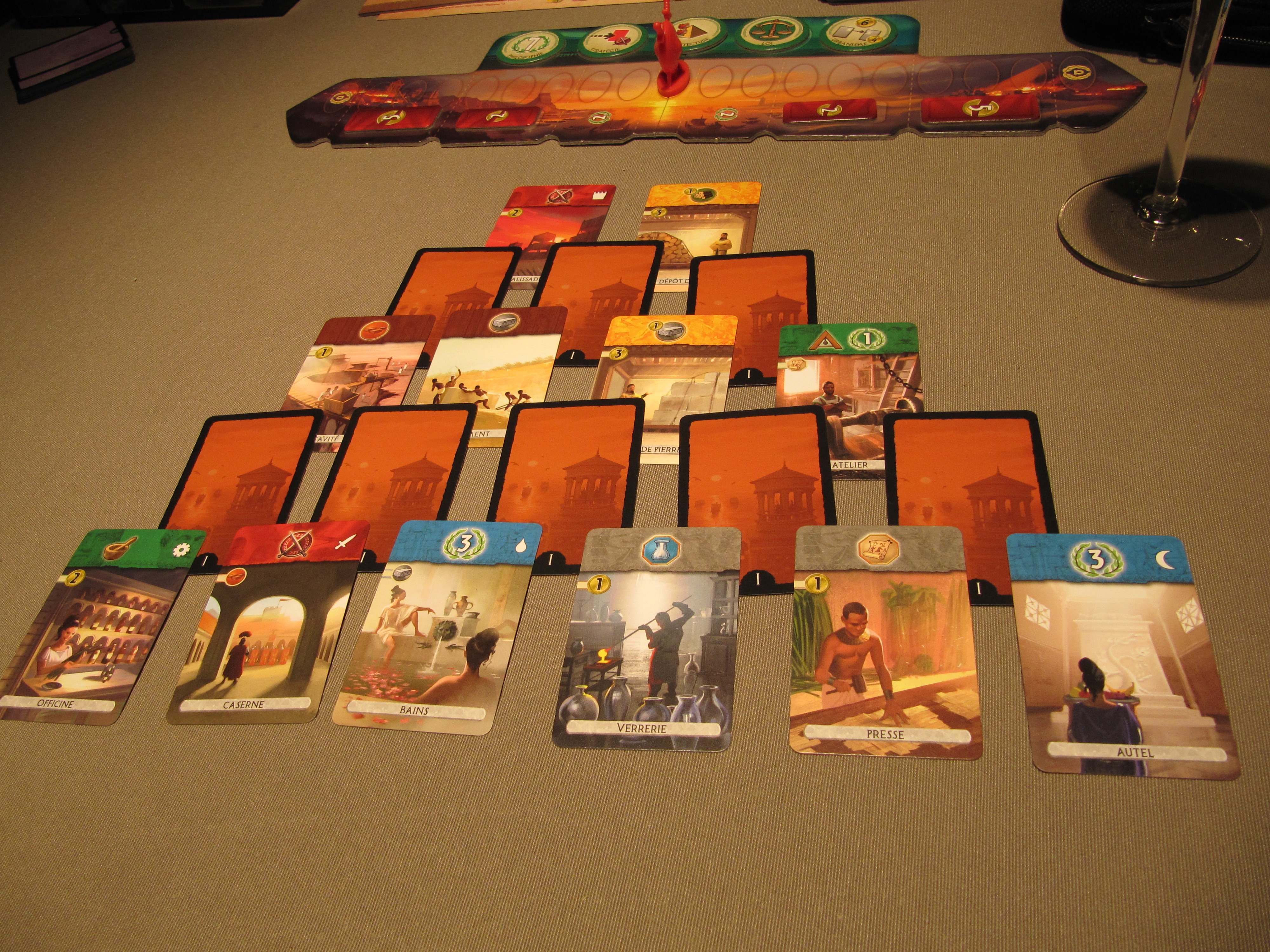 C’est évidemment la plus grande révolution de cette version. Alors que ce qui a fait le succès et la particularité de 7 Wonders c’était, entre autre, son système à l’époque novateur de draft de cartes (même si les passionnés de Magic comme moi connaissions déjà 😉 ), 7 Wonders Duel laisse tomber ce système au profit d’un système « Mahjong ». On a d’ailleurs déjà vu ce système chez Siggil. Mais les 2 jeux ayant une date de sortie assez rapprochée, je ne pense pas qu’il y en ait un qui ait inspiré l’autre. Mais bon, je ne suis pas dans le secret des dieux (sur ce coup-là du moins 😉 ). Le système est néanmoins légèrement différent de Siggil puisqu’il propose une mise