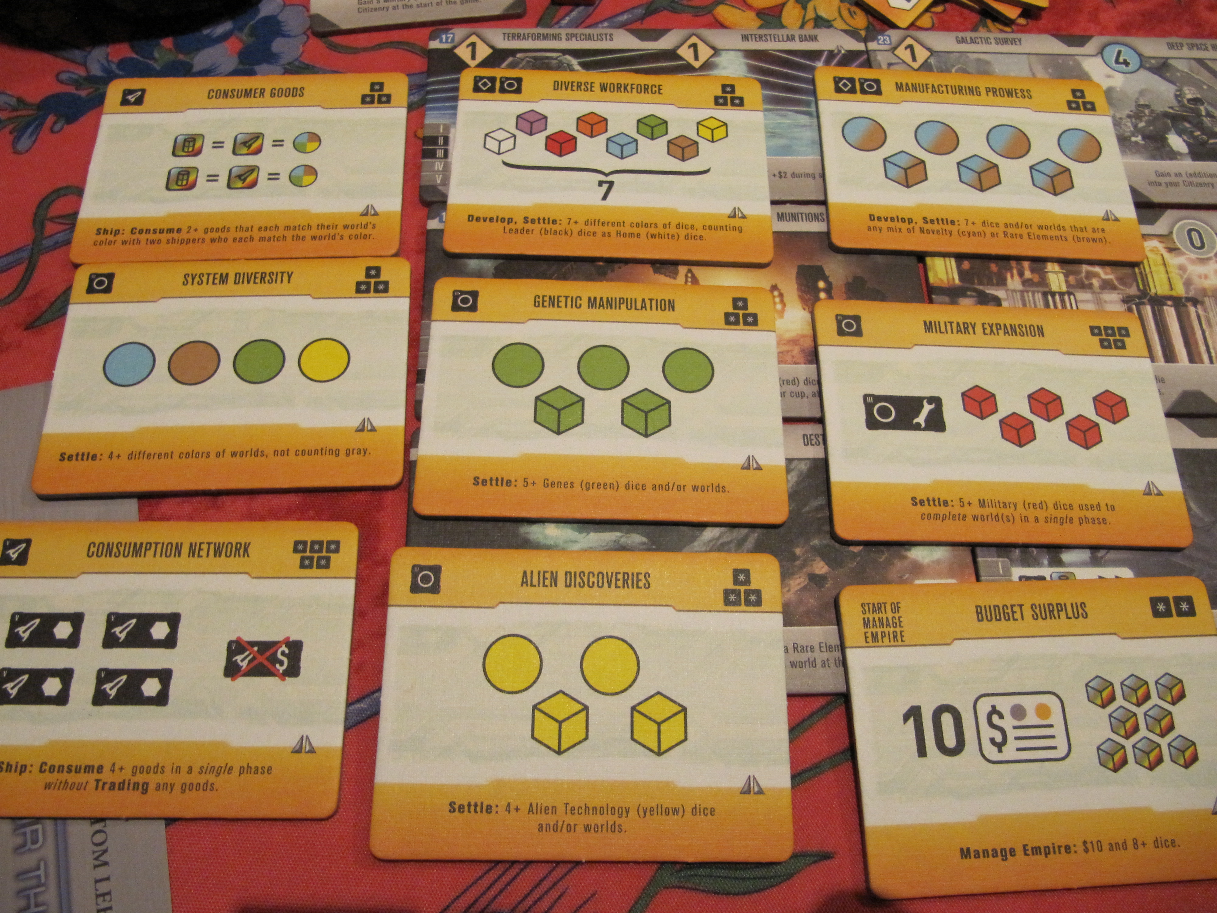 Bien que simple et peu original, c’est le module qui m’a le plus enthousiasmé. Il s’agit de 20 tuiles objectifs parmi lesquelles on va en tirer 6 au hasard en début de partie. Ce sont des objectifs que tous les joueurs peuvent atteindre: avoir x mondes et x dés d’une certaine couleur, avoir 10 dés et 10 crédits, avoir 7 dés de 7 couleur différente,… Dès qu’un joueur atteint un objectif, on retourne la tuile objectif pour indiquer que plus personne ne peut le réclamer et le joueur reçoit entre 2 et 5 jetons « étoiles » en fonction de l’objectif réalisé. Chacun de ces jetons vaut 1 PV en fin de partie s’il n’a pas été utilisé. En effet, on peut utiliser ces jetons comme un dé action de n’importe quelle face en le défaussant.