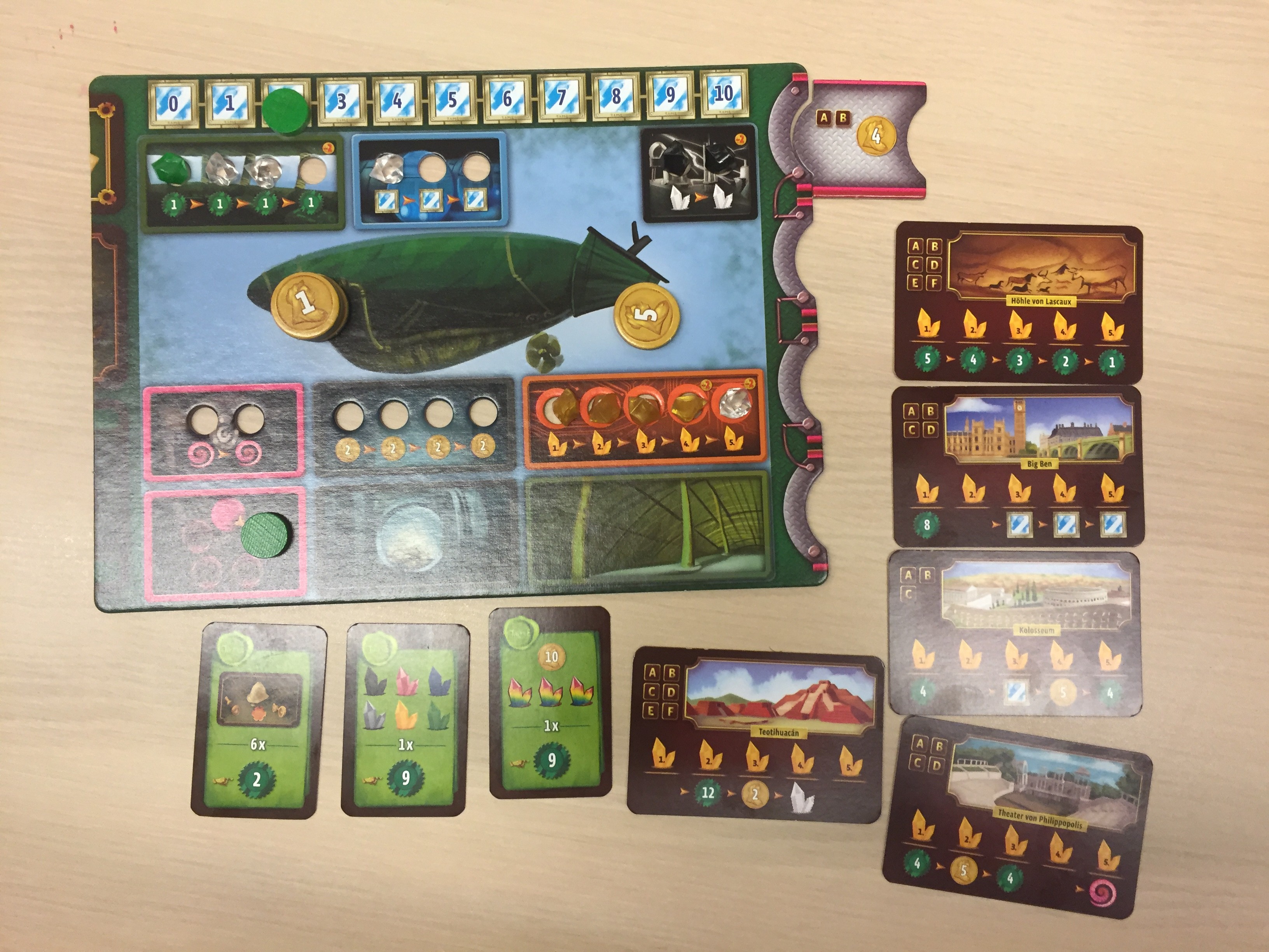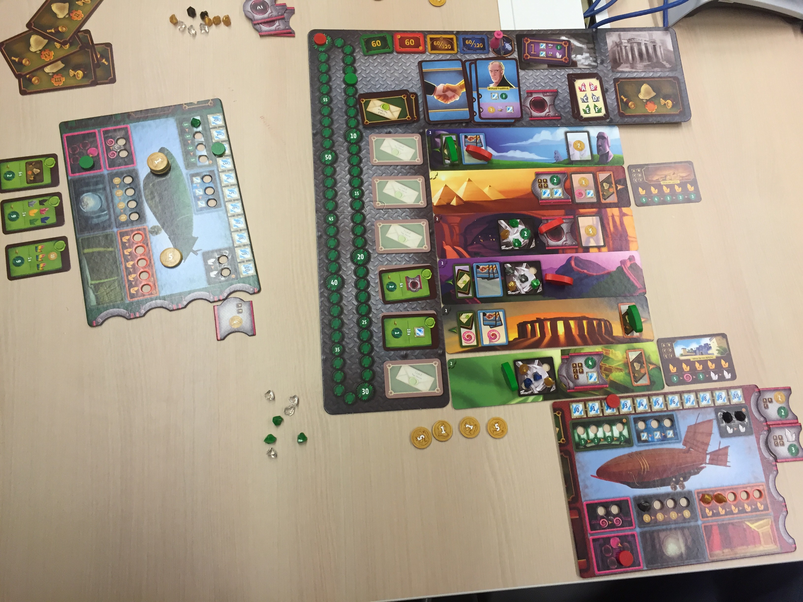 La mécanique de base est fortement inspirée de celle d’Egizia. Chacun, à son tour, place un de ses 3 dirigeables sur une case d’action. Les second et troisième dirigeables doivent être placés plus en avant que ceux déjà placés. Ce qui diffère par rapport à son aîné, c’est qu’on n’a plus affaire à une piste d’actions mais à des languettes comprenant chacune plusieurs actions possibles. Les 6 languettes d’actions sont placées les unes au-dessus des autres aléatoirement (voir la photo). Lorsqu’on place un de ses dirigeables sur une languette, on devra placer les suivants sur les languettes supérieures. Entre chacun des 5 tours, on va déplacer la languette du haut pour la placer tout en bas ce qui offre pas mal de variété au jeu.