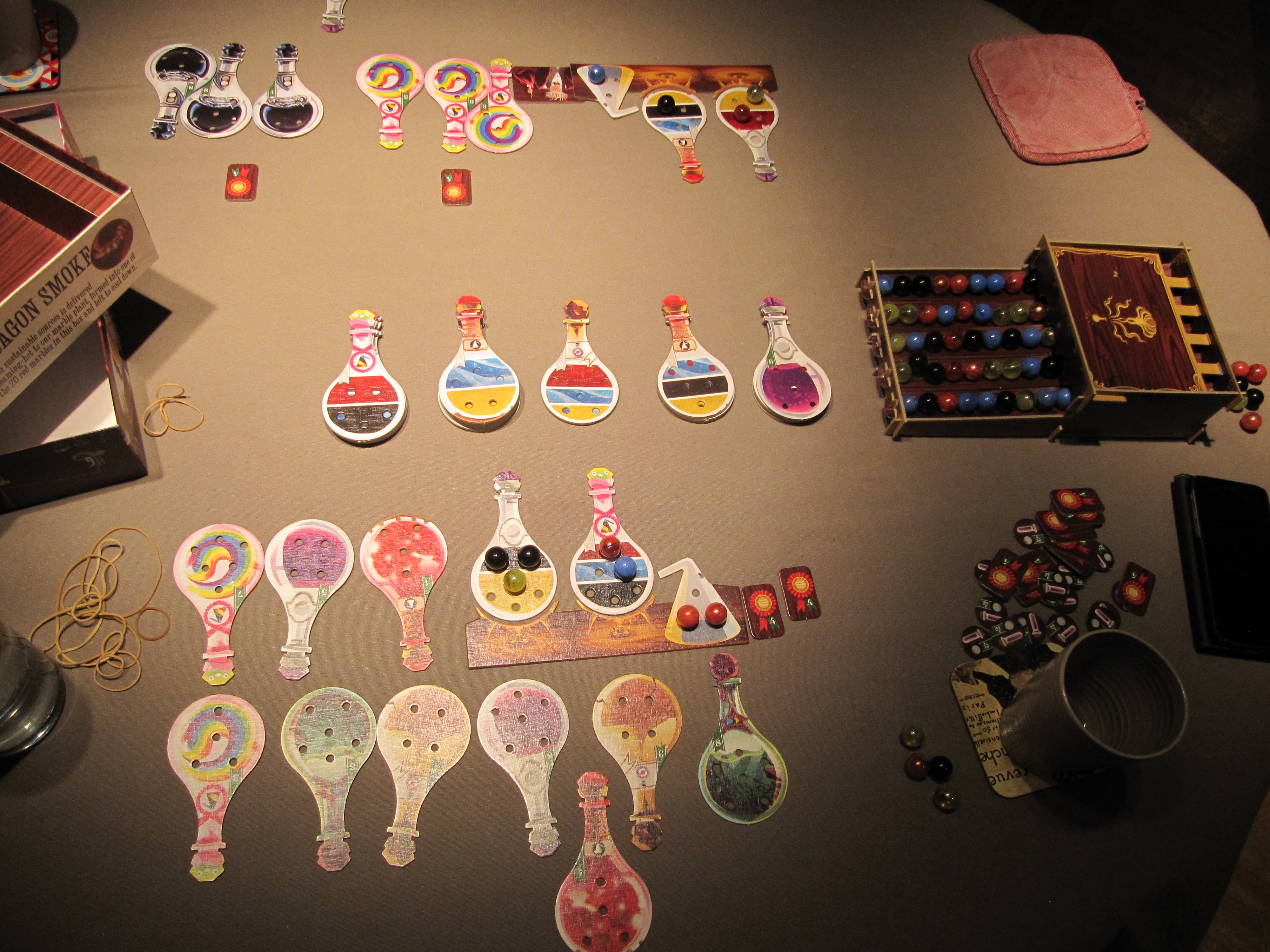 Le nombre de billes prises est important car celles-ci servent à remplir des potions. Chaque joueur dispose de 2 potions devant soit qui exigent une combinaison de billes de différentes couleurs (ex : 2 rouge, 1 noir et 2 bleues). Lorsqu’une potion est réalisée, on la range dans son laboratoire et on prend une des 5 disponibles au centre de la table pour la réaliser à son tour.