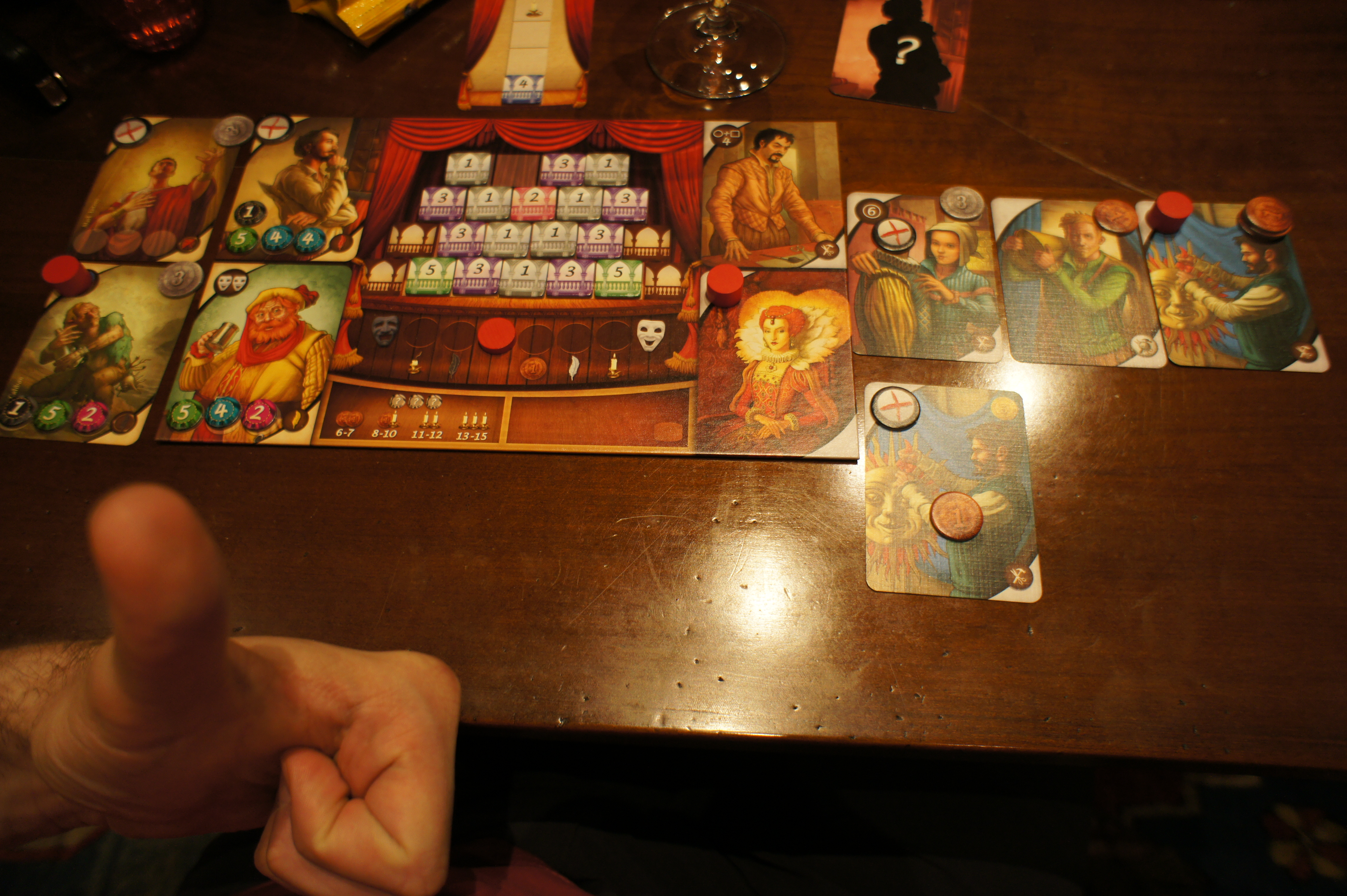En effet, lors de la phase d’enchère, comme dans le jeu de base, vous allez miser le nombre de jetons action que vous voudrez jouer ce tour-ci. Dans le jeu de base, vous perdez, pour le tour, les jetons que vous ne misez pas. Avec les coulisses, ils ne sont pas perdus puisqu’ils pourront servir en coulisse. Autrement dit, l’écueil que je faisais dans ma critique sur Shakespeare, à savoir, le fait qu’on va souvent miser le maximum de jetons action possibles pour ce tour, disparait complètement ici.