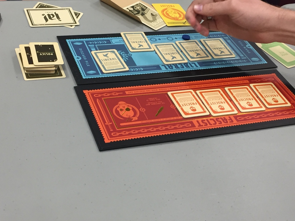 Mais peu importe finalement tant Secret Hitler est magnifique. Et, ça va vous étonner, la première chose qui plaît est l’imprégnation du thème dans le jeu. Les joueurs reçoivent un rôle caché qui peut être soit libéral, soit fasciste normal, soit fasciste Hitler. A chaque tour, un nouveau président va désigner un chancelier. Les joueurs vont devoir voter pour le nouveau gouvernement qui va édicter une loi qui sera soit une loi libérale soit une loi fasciste. Mais élire une loi fasciste peut être intéressant et tentant, même pour un libéral. Les libéraux l’emportent s’ils élisent 5 lois libérales ou s’ils tuent Hitler. Les fascistes l’emportent s’ils élisent 6 lois fascistes ou si Hitler est élu chancelier alors que minimum 3 lois fascistes sont déjà votées.