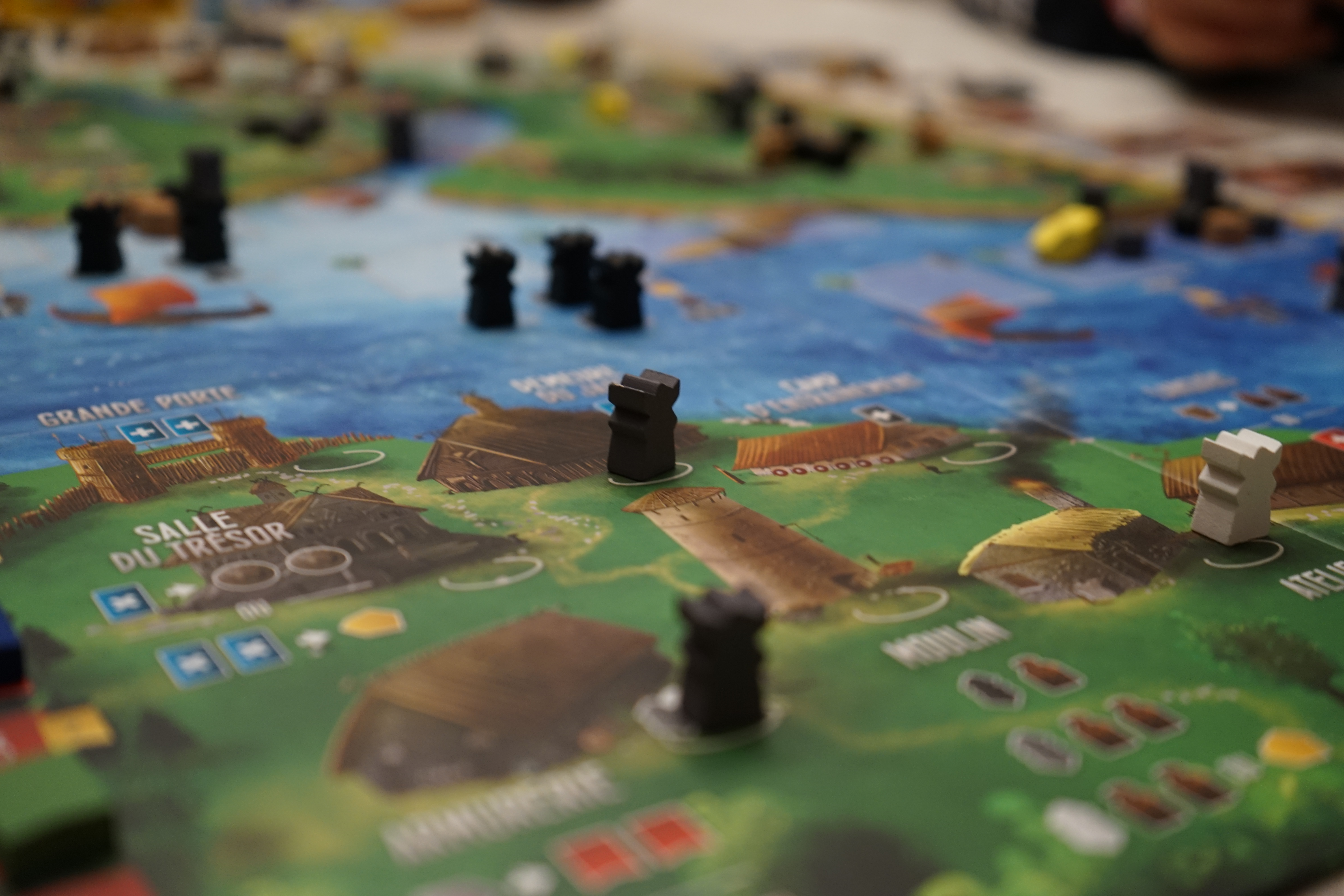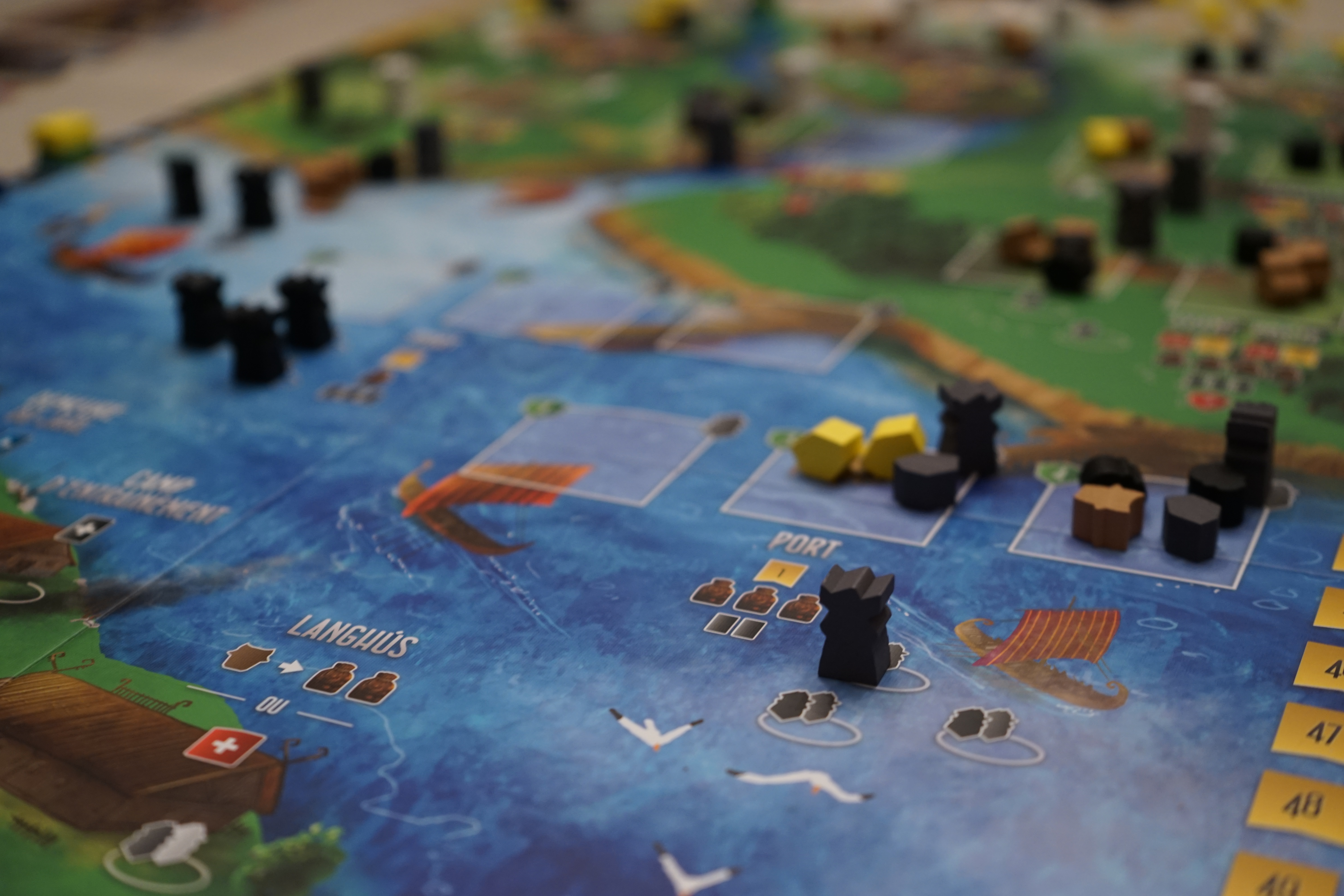 On a déjà vu cette mécanique dans d’autres jeux comme dans l’excellent Manhattan Project mais c’est toujours agréable de jouer avec cette notion de spécialisation.  Il existe 3 couleurs de vikings (les noirs, les gris et les blancs).  Les différentes cases action indiquent quelle(s) couleur(s) de viking sont acceptées sur la case pour réaliser l’action ou quels effets différents sont provoqués par certaines couleurs de vikings.  Il y a des couleurs qui rapportent plus de ressources que d’autres et d’autres qui peuvent réaliser des raids lointains (plus lucratifs)…  Ces contraintes et opportunités sont des éléments supplémentaires à gérer qui apportent plus de profondeur au jeu.