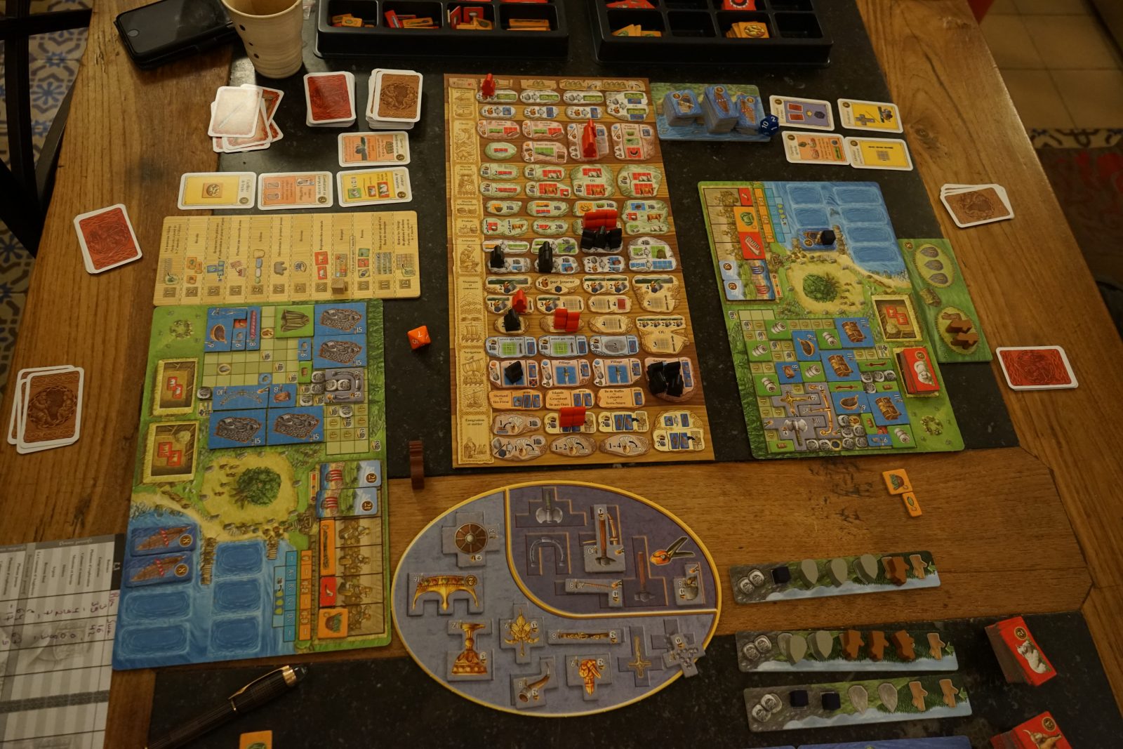 En fin partie, assez longue vu les choix innombrables, mon intuition est mitigée. D’un côté emballé par l’imbrication et la montée en puissance au fur et à mesure de la partie. D’un autre côté, une complexité « à migraine » qui rend le jeu assez lourd dans son ensemble. Ajoutons à cela le peu d’interaction entre les joueurs, même indirecte. En effet, même si une action visée est prise, on trouve toujours une autre qui répondra à un besoin future.