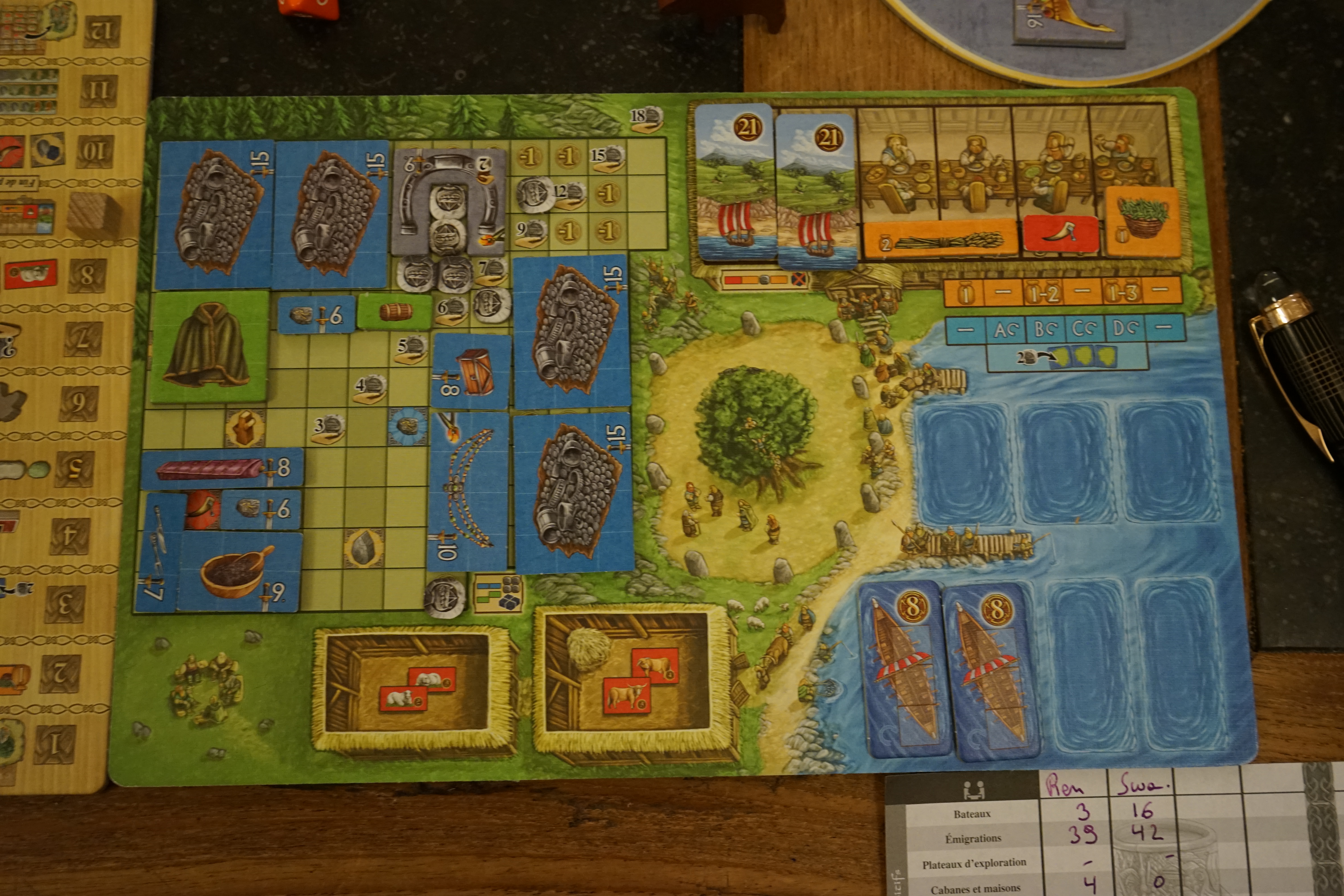 – le matériel est surabondant (et assez beau pour ma part), avec des tuiles représentant les dizaines de ressources, bateaux, flancs de montagne, argent, nouvelles constructions différents… C’est un plaisir de récolter une tuile chou, et pas « un cube jaune qui sert à nourrir vos vikings ».