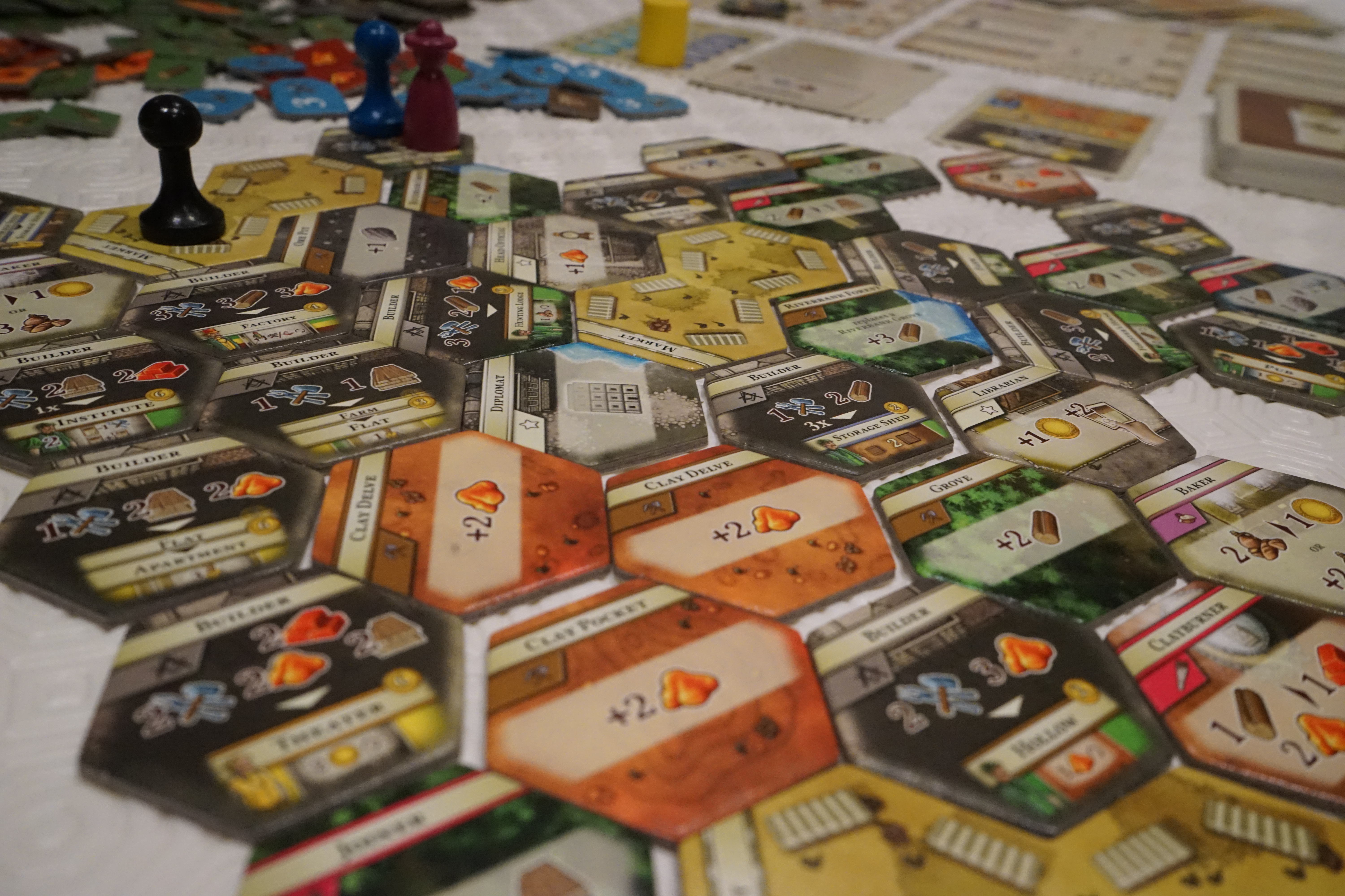 Contre des ressources et en réalisant l’action associée, on peut retourner un bâtiment côté verso. Le bâtiment devient alors beaucoup plus puissant. Cet aspect qui semble anodin (pourquoi ne pas construire tout simplement un nouveau bâtiment ?) apporte une profondeur supplémentaire au jeu car vous allez construire des bâtiments, non pas seulement pour l’effet qu’ils apportent maintenant mais pour les bénéfices qu’ils génèreront lorsqu’ils seront améliorés.
