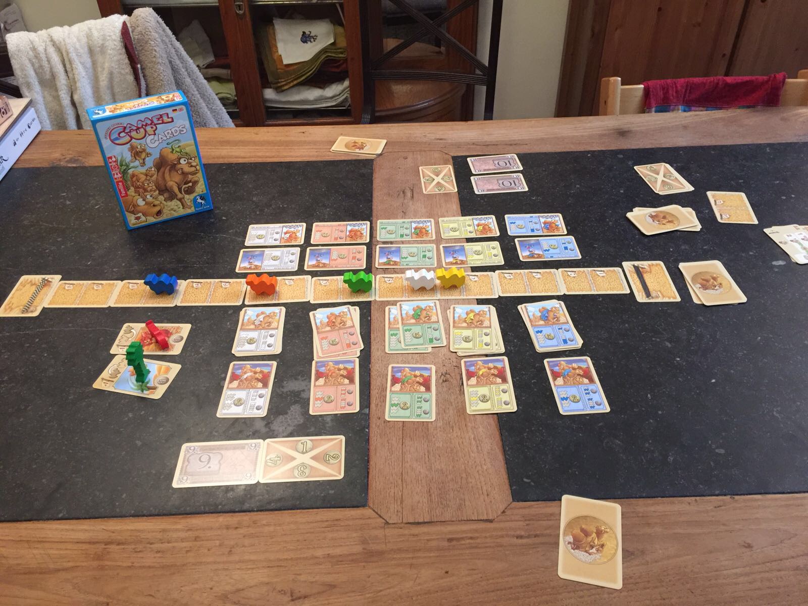 1. piocher une carte du deck et faire avancer le chameau correspondant du nombre de cases indiquées (je tire une carte chameau jaune de 2 –> j’avance le chameau jaune de 2)