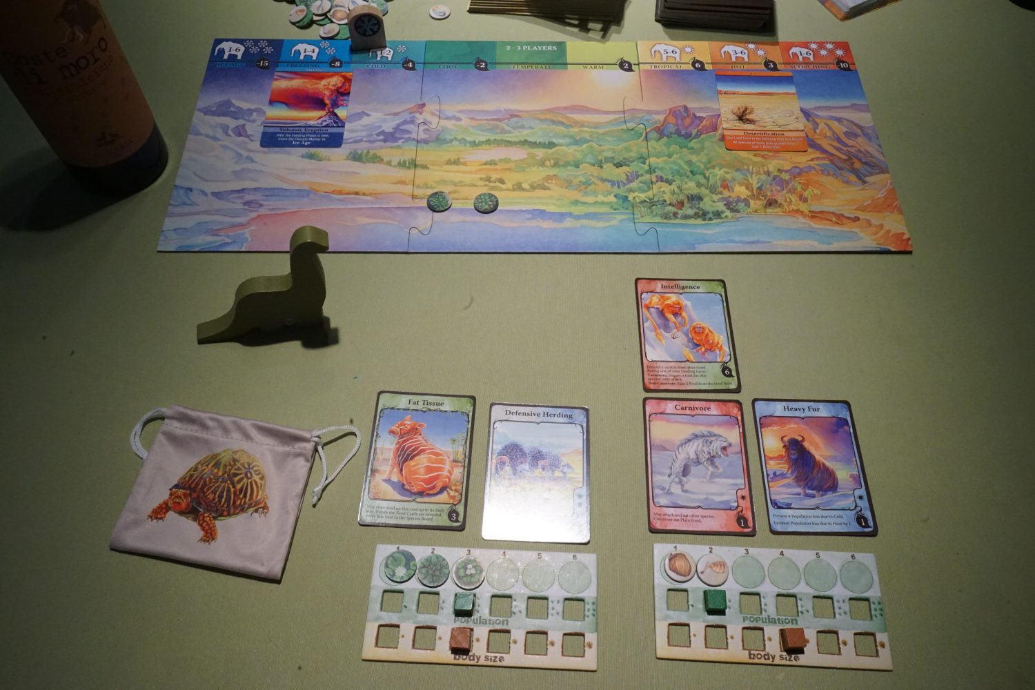 Durant cette phase de nourriture, Climate introduit la notion de changement climatique.  Les cartes défaussées vont indiquer si le pion climate évolute vers le réchauffement climatique ou vers la glaciation.  Dès qu’il fait trop chaud ou trop froid, les espèces les moins bien équipées contre le chaud ou le froid vont perdre de la population.  De plus, dès que le climat atteint certaines valeurs, des événements généralement pas très sympathiques vont se déclencher.  Mais rassurez-vous, de nouvelles cartes caractéristique vont vous permettre de survivre par ces températures extrêmes.  De nouveaux vont donc s’offrir à vous dans la sélection des cartes.