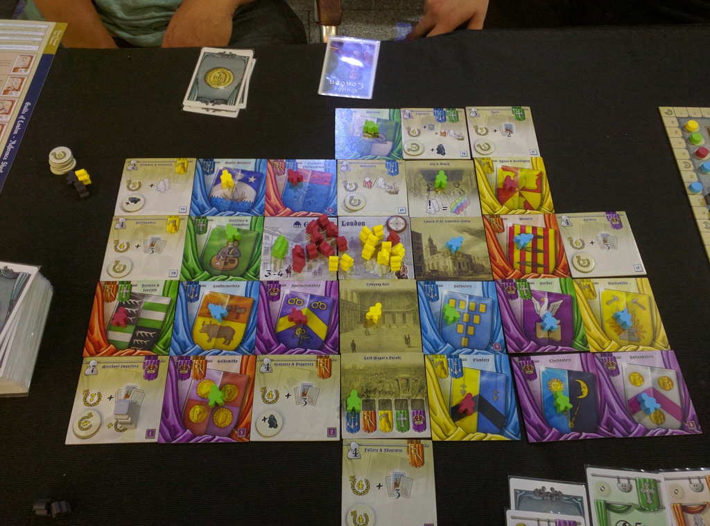 Guilds of London est un jeu de majorité/contrôle de zone. Le plateau est constitué de 2 tuiles Hôtel de Ville entourées de 10 autres tuiles. Au fur et à mesure de l’avancée du jeu, d’autres tuiles vont venir s’ajouter en augmentant les différentes possibilités. Cette évolution du plateau au fil du temps offrant plus de choix est une des bonnes idées du jeu.