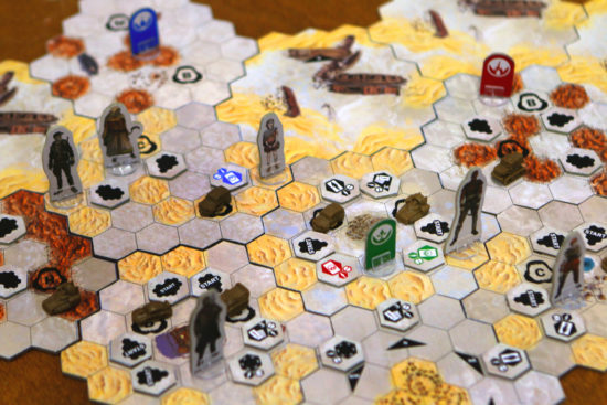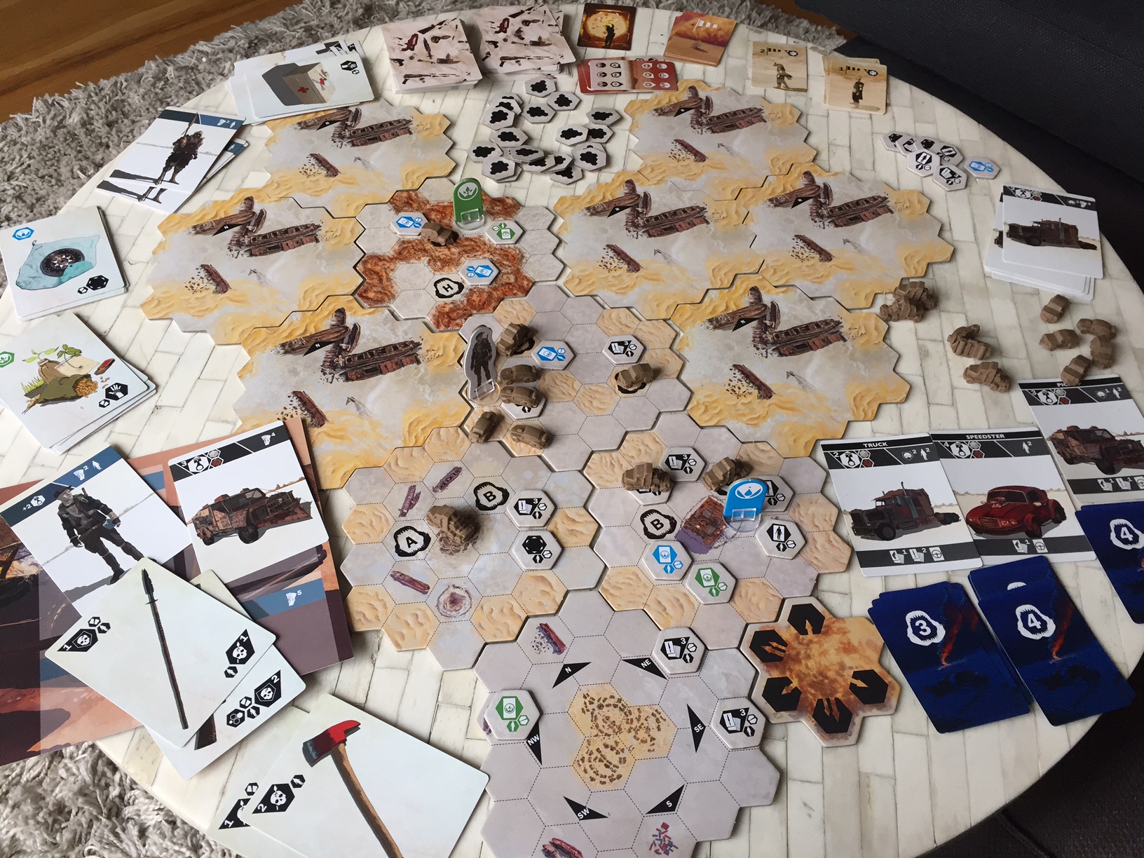Evidemment la gestion de sa main de carte est primordiale et notre jeu peut changer en fonction de ce que l’on trouve dans le désert, adaptation tactique et renouvellement stratégique en cours de partie. On va changer de véhicule ou pas, mais en tout cas avec le bon timing et si nécessaire se retrouver pour échanger du matériel…
