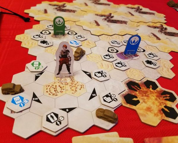 Et attention la pression monte vite ! Un point que j’apprécie, on commence tranquille mais très vite les pillards deviennent très, trop pressant, les sorties du désert s’éloignent… La pression monte crescendo, très bonne sensation. Dès le début il faut viser les rumeurs sinon 6 tours… ça passe vite… Au passage cette mécanique des rumeurs est très bien trouvée, thématique et ludique, obligeant à bien gérer le positionnement sur la carte de tout le monde, car sinon viendra la fatidique phrase « Mais… Je ne vais jamais pouvoir aller jusqu’à la sortie en 2 tours… ». Car la fin s’anticipe dès le début : où sortir ? Récolter les cartes victoire et enfin attirer les pillards loin de la zone de sortie, pour … rusher sur la tuile !
