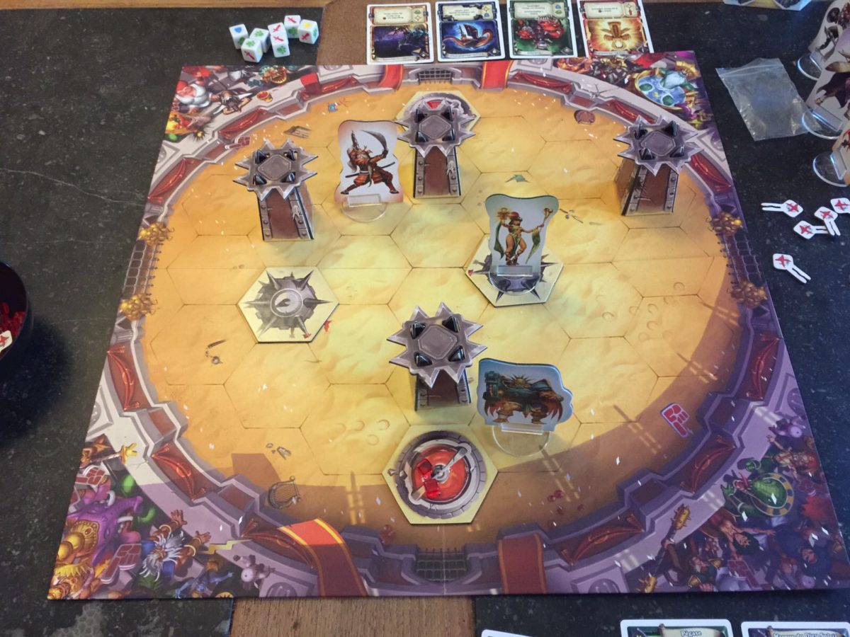 Arena for the gods, à l’instar du must qu’est king of tokyo, ne demande pas une grande stratégie, mais réclame juste quelques joueurs qui ont envie de se défouler en se tapant dessus. Pour cela, rien de plus simple, on balance quelques dés, et on exécute le pouvoir de 4 cartes grâce aux faces obtenues. En général, on y arrive souvent, car on a même droit à un relancer. Il faut, bien sûr, avoir bien mixé ses cartes…. Bref on s’éclate (et pas seulement la tête). C’est archi simpliste mais assez amusant, ma foi.