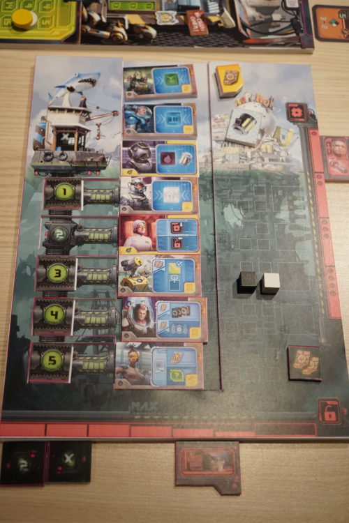 Avec Outlive, Saltlands, Anachrony et également Black Angel, le jeu en cours de développement chez Pearl Games, le thème post apocalyptique a le vent en poupe! Mais aucun des jeux cités n’évoque la montée des eaux qui s’annonce pourtant inéluctable avec le réchauffement climatique. Heureusement, Otys palie à ce manquement. Chaque joueur est à la tête d’une cité dont la majeure partie est engloutie sous les eaux. C’est ce que représente le plateau personnel (photo de droite). Chaque joueur a 8 plongeur spécialisés qui vont devoir plonger sous les eaux pour réaliser leurs action.