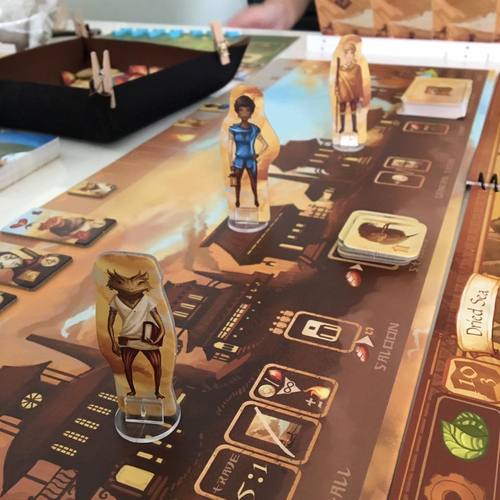 Ici, chaque joueur va contrôler une bande de héros qui va voyager dans la campagne en rentrant de temps en temps au village pour faire le plein de ressources et d’équipements, et engager de nouveaux aventuriers afin d’aller encore plus loin dans l’aventure. Sur le parcours, vous avez construire des huttes, rencontrer des menaces et découvrir des trésors. Les combats se jouent avec un seul dé qui va pouvoir être amélioré avec vos capacités et vos ressources de telle sorte que vous ne pesterez jamais contre le hasard même si des jets malheureux vous feront rentrer au village plus rapidement.