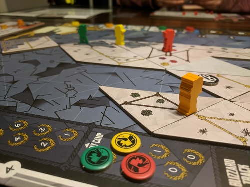 On lance le dé événement qui va nous indiquer si on pioche le prochain événement et le dé météo qui va nous indiquer combien de portion de nourriture on va devoir manger. Avec la pioche des tuiles corde, c’est ce hasard qui est le plus rebutant dans Summit. Surtout que c’est limite d’un point de vue thématique : comment expliquer qu’une météo peut être clémente pour un joueur et terrible pour celui situé juste à côté ?