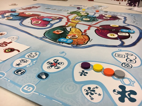 On n’est plus sur d’immenses bateaux qui doivent se faufiler dans l’étroit passage du Panama ici mais dans le corps humain. Sa représentation conceptualisée et colorée sur le plateau de Viral ne peut qu’attirer le regard. Nous y retrouvons les différents organes qui correspondent à des zones dans lesquelles il vous faudra avoir la majorité des virus si vous voulez obtenir des PVs. Ha oui j’oubliais, dans Viral vous représentez un type de virus ! Décidément, avec Medical Frontier, il semble que le thème initié par Pandemie ait fait des petits 😉