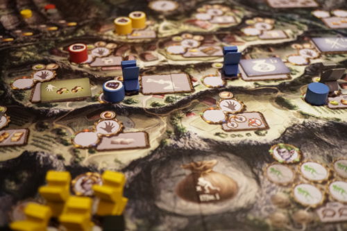 – Les actions: les emplacements pour les actions se composent de 2 cercles, nécessitant donc 2 pions Action. Néanmoins, si l’un d’entre eux est occupé par une Pixie, seul un pion Action sera alors nécessaire. Cette astuce exige de bien penser le déplacement de ses Pixies afin d’éviter de faciliter l’accès aux actions qui semblent les plus intéressantes (principalement les plus hautes sur la montagne) à ses adversaire. L’ordre du tour s’avère important ici.