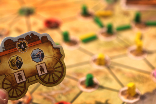 - Dès que la diligence arrive sur une case avec un pionnier, elle doit s’y arrêter, y déposer le meeple dont la couleur sur le carrosse correspond et prendre la tuile pionnier de la ville.