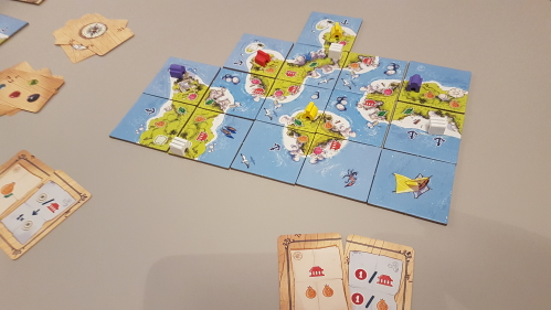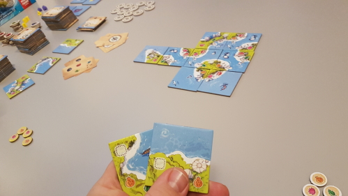 20180904_203159A son tour, un joueur choisit une tuile parmi les trois visibles disposées à l’installation du jeu. Il la remplacera alors par une des 6 tuiles de la pioche navigation. Il possède donc trois tuiles en main. Il dispose ensuite une tuile depuis sa main en complétant le paysage de celles déjà posées. Le choix et le placement seront en rapport avec son objectif (ou objectif futur). En effet, les objectifs donneront des points sous certaines conditions pour chaque île. On pourra, par exemple, avoir besoin d’îles contenant des lots de 2 fleurs et 1 temple, ou encore avec 5 ports, etc… L’explorateur aura alors intérêt de placer ces tuiles de manière à répondre à ses objectifs. L’astuce consiste également à entraver les adversaires si on a deviné leur objectif.