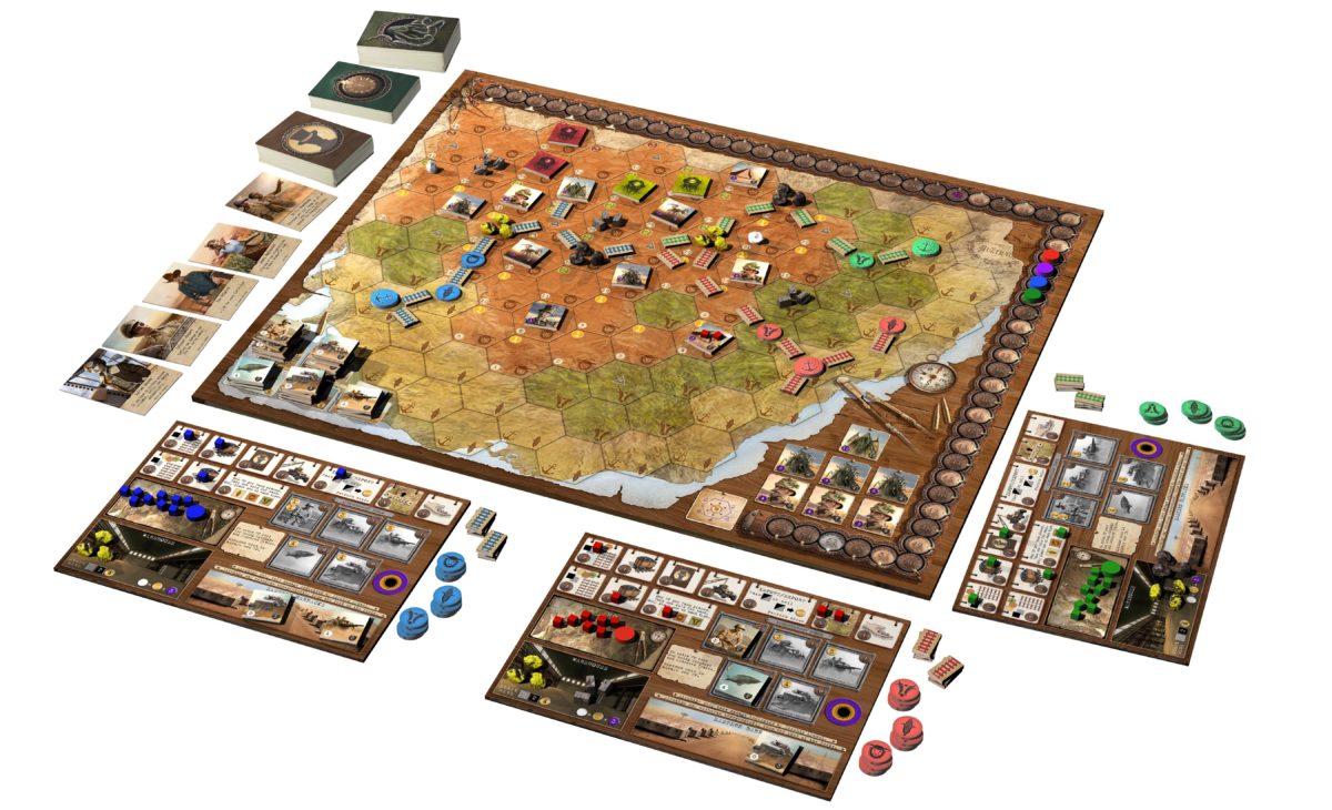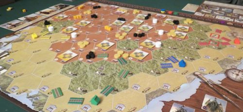 Les actions sont assez classiques puisque, contre des ressources, on va pouvoir étendre son réseau de rail et construire des unités militaires. La récolte des ressources est-elle un peu plus étonnante puisque les ressources sont réparties de manière aléatoire sur la carte lors de la mise en place. Outre ces ressources assez nombreuses sur le plateau, une autre action permet d’en gagner mais beaucoup moins. Cela va donc engendrer une sorte de course à la ressource entre joueurs qui vont étendre le plus rapidement possible leur réseau ferroviaire afin de passer par un maximum d’endroits lucratifs avant leurs adversaires.