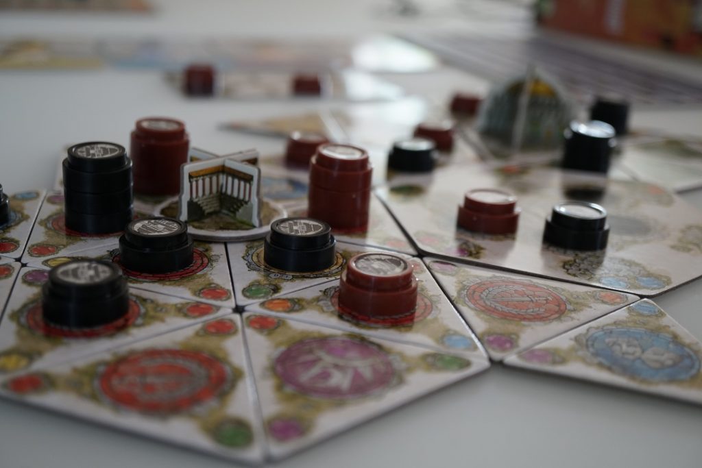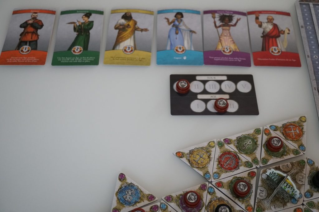 Le jeu se joue en 3 âges répartis en 5 manches chacun. Lors de chaque manche, les joueuses vont effectuer, chacune à leur tour, les 3 phases d’une manche. La première consiste à placer une de leurs tuiles paysage afin de gagner les ressources de la tuile et de celle adjacente. Comme ces tuiles se piochent au hasard en début d’âge, le hasard peut jouer un rôle ici et peut avantager l’une ou l’autre joueuse. Mais no stress, ce qui est vraiment très bien fait dans Dominations, c’est que le jeu propose toujours une sortie de secours 😉 Si les tuiles de votre main ne vous conviennent pas pour l’une ou l’autre action que vous vouliez réaliser, elles peuvent toujours vous servir pour d’autres actions tout aussi rentables…