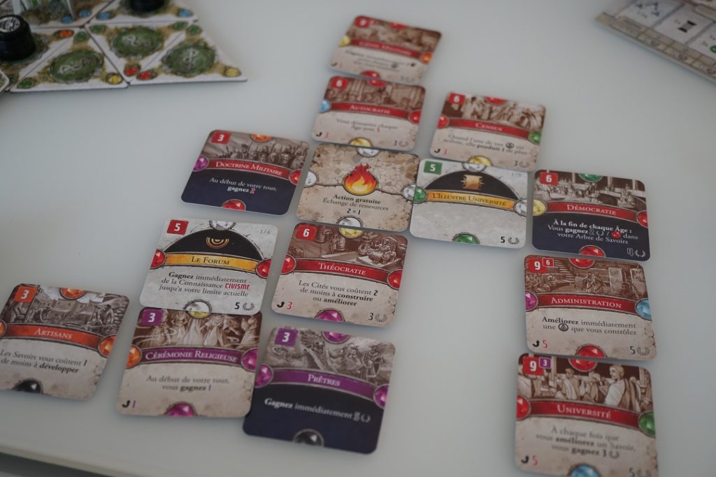 Vous pourrez également développer votre arbre teXnologique. Et comme dit plus haut, c’est là où Dominations explose. Le jeu de base ne propose pas moins de 72 technologies différentes réparties entre les 6 ressources du jeu (les ressources sont appelées des types de connaissances: le commerce, l’artisanat, l’art, la science, le civisme et la religion), soit 12 technologies différentes par type de connaissance. De plus, chaque technologie, appelée ici « savoir », peut être améliorée. Vous imaginez les possibilités énormes et les combinaisons infinies que ce système permet?