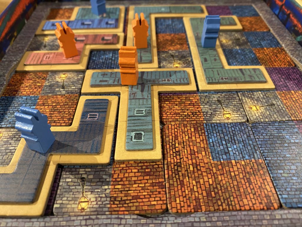 Ensuite, durant la deuxième phase donc, les joueurs placent à tour de rôle, leurs tuiles Bâtiment sur les tuiles Pavés préalablement placées. En respectant les règles de placement, bien entendu. C’est-à-dire que le joueur Orange ne peut placer ses bâtiments que sur les cases de sa propre couleur et/ou sur des cases mixtes et que le joueurs bleu ne peut placer ses bâtiments que sur les cases bleues et/ou également les cases mauves (mixte). Seules les cases grises (lampadaire) ne peuvent pas être recouvertes par un bâtiment.