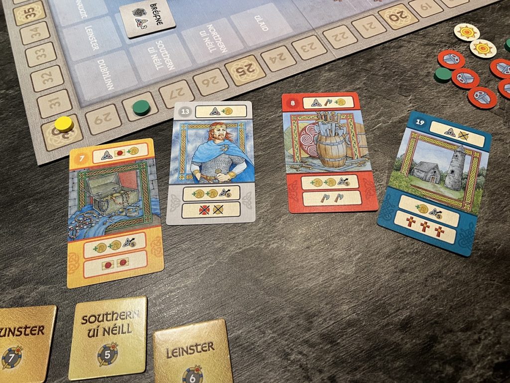 A cette mécanique de majorité s’ajoute une mécanique de plis extrêmement bien faite. Ce sont ces plis qui vont déterminer quelles actions vous allez pouvoir réaliser. Au début de chacune des manches, vous allez drafter les cartes puis les jouer en plis. Chaque carte propose 2 ou 3 actions différentes. Une principale et une ou deux secondaires. Vous ne pourrez réaliser l’action principale (= la prise de contrôle d’une ville) que si vous remportez le plis. Au début de chaque plis, le premier joueur va déterminer la ville active, càd celle pour laquelle on se bat. Déjà là ça peut vous donner une idée de la subtilité de Brian Boru. Si je suis premier joueur, vais-je proposer une ville qui m’intéresse alors que je débute le plis et que les autres joueurs vont pouvoir me le prendre? Ou vais-je choisir une ville qui ne m’intéresse pas en jouant une petite carte pour en réaliser une de ses actions secondaires? Et si personne ne propose une ville qui m’intéresse, comment vais-je pouvoir la conquérir? Il vous faudra alors gagner un plis pour pouvoir proposer une ville intéressante.