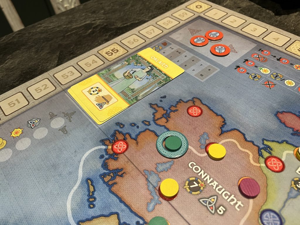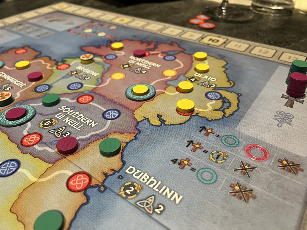 Et la magie de Brian Boru est qu’on retrouve tous ces éléments historiques dans le jeu. Vous allez conquérir des villes sur la carte d’Irlande tout en scellant des mariages arrangés, en repoussant les vikings et en vous alliant à l’Eglise. Et tout cela, grâce à une mécanique assez simple de majorité: si vous obtenez une majorité de villes dans un région, vous régnez sur cette dernière (et gagnez les PVs associés 😉 ). Si vous êtes plus avancés sur la piste de mariage que vos adversaires, vous obtenez les bénéfices de la carte mariage de la manche. Si vous avez récolté plus de jetons viking que vos adversaires, vous gagnez des PVs et/ou vous rasez une ville adverse au nom des vikings. Enfin, si vous influencez majoritairement l’église, une de vos villes recevra une monastère, doublant son influence sur sa région.