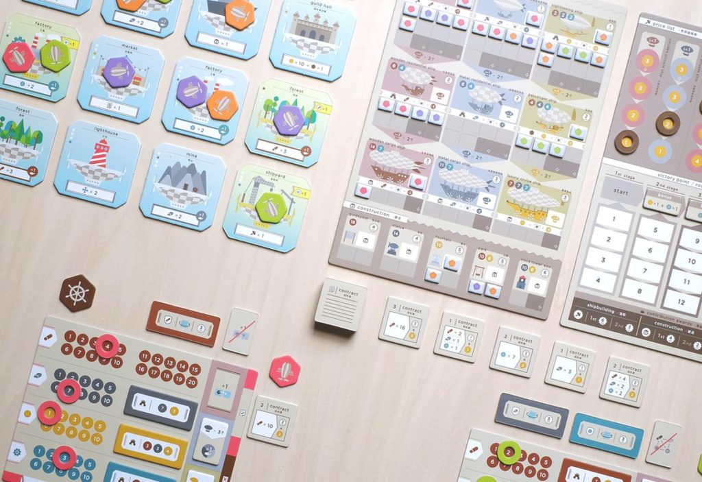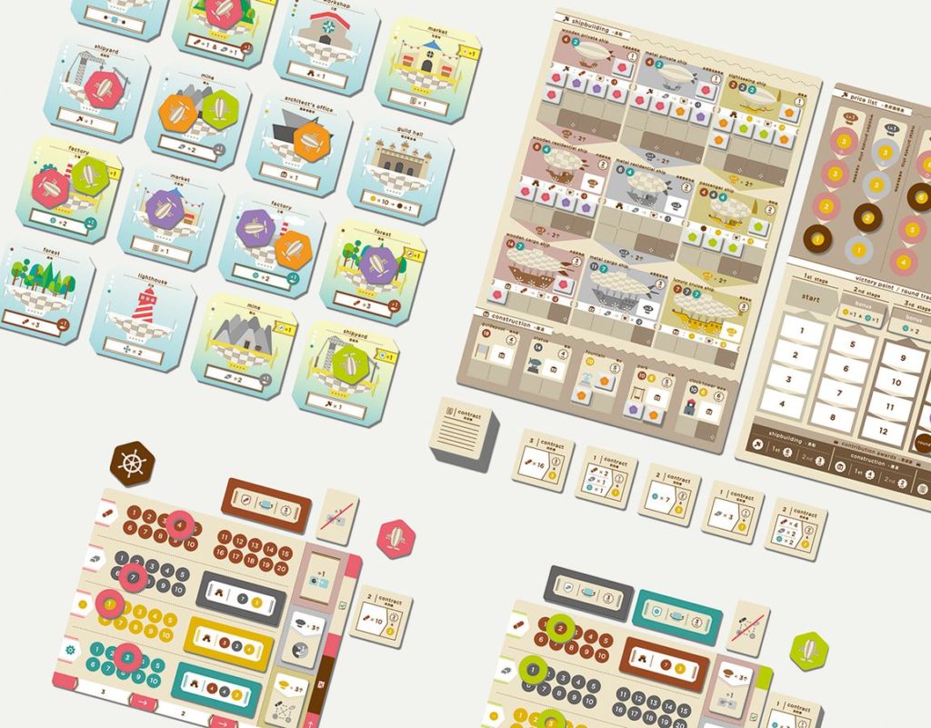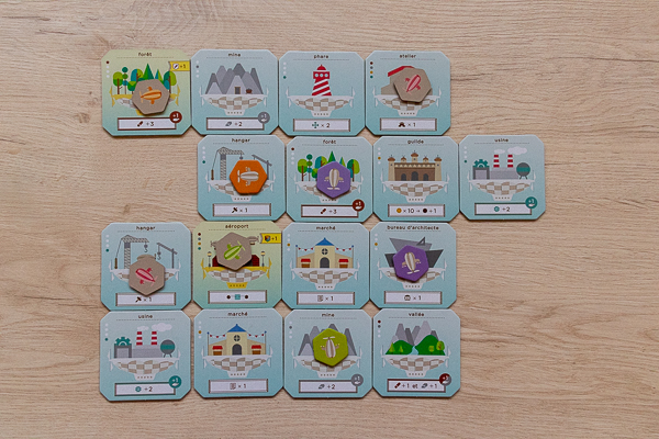 Pour construire un dirigeable, il faut des ressources différentes en fonction du type d’aéronefs. Une fois les ressources dépensées, vous pouvez soit vendre votre dirigeable au marché, soit en faire don à la communauté. Si vous optez pour la vente, cela vous rapportera de l’argent. Le prix est fixé en fonction du marché, les premiers vendus rapporteront plus que les derniers. À chaque transaction, le cours baisse d’une unité. Attention car il n’y a aucun moyen de faire remonter les cours du marché, si vous voulez que cette action soit rentable, il faut vendre dans les premiers ! Ceci est d’ailleurs un peu dommage car les joueurs ont alors tendance à faire les mêmes actions au même moment : tant que les cours sont élevés tout le monde vend puis quand ils sont bas tout le monde s’oriente sur la donation. Si vous optez pour la donation, il faut placer un token à votre couleur sur le plateau Contribution qui reflète vos efforts pour l’amélioration de la cité en termes de construction de dirigeables ainsi que de bâtiments publics. Ces derniers serviront à établir les majorités.
