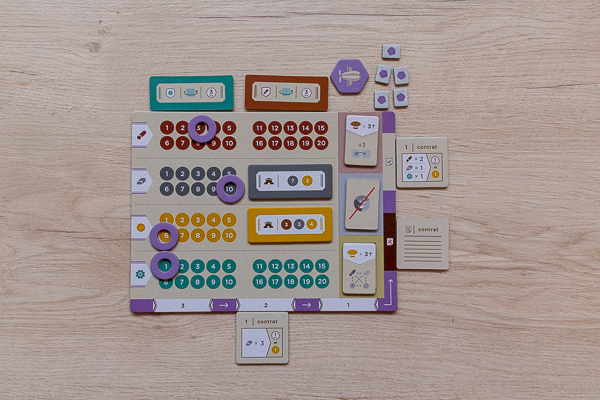 Outre cette mécanique très savoureuse, le reste du jeu est quant à lui beaucoup plus conventionnel. La majorité des actions disponibles vous permettent de récolter ou transformer des ressources, de progresser sur des échelles technologiques et de remplir des contrats. Pour bénéficier d’une échelle, il faut être la joueuse qui la domine. Le jeu ayant 3 échelles, cela peut poser des problèmes si vous y jouer à 4… De plus, à 3, vous tomberez souvent sur un consensus, chacune étant maître d’une échelle…
