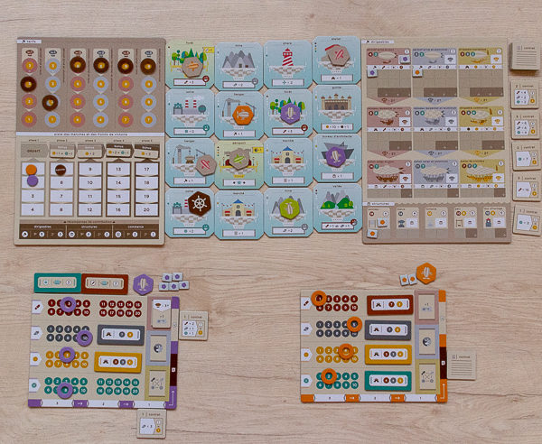 Le thème donne tout de suite envie de jouer mais en ouvrant la boîte, la déception est grande. Les illustrations sont très cubiques et les couleurs sont bien fades. Avec le thème du ciel, je ne m’attendais pas à avoir des plateaux beige et marron ! Où sont passés le bleu azur du ciel et le jaune éclatant du soleil ? Les goûts et les couleurs …