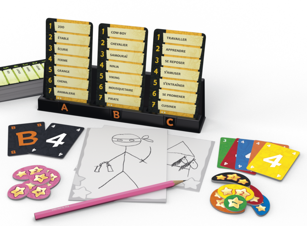 Le truc très sympa est que chaque carte est développée sous un thème. Si, par exemple, on est amené à faire deviner l’Age de Glace, les autres mots de la carte représenteront la Reine des Neige, Toy Story, Shrek et autre Wall-e. Autrement dit, il faudra bien faire attention de distinguer votre dessin des autres mots de la même carte thématique. De plus, Pictomania se joue en 4 manches et, à chaque manche, vous devrez jouer avec un paquet de cartes différent en passant du vert au jaune, puis à l’orange pour terminer avec le rouge qui représente les mots les plus difficiles comme, par exemple, tous les rôles d’un tribunal… Même si ça peut faire peur, ne vous privez pas de ce crescendo qui, en corsant la difficulté, apporte pas mal de plaisir.