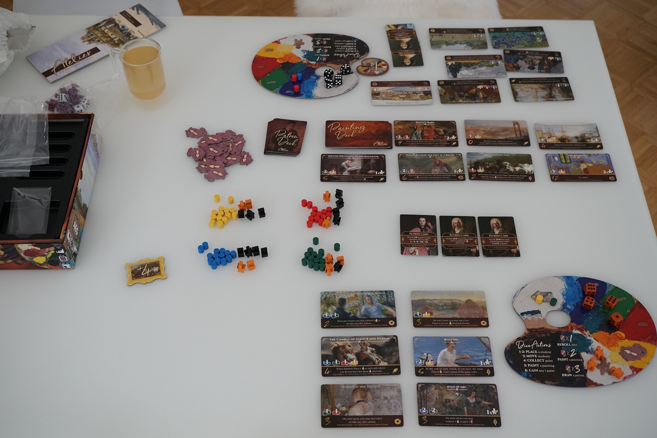 Atelier propose donc différents axes stratégiques qui vous poussent à orienter vos stratégies en fonction de vos cartes objectifs tout en ayant des choix tactiques cornéliens: que faire avec chacun de vos dés, à quel rythme et quelle peinture peindre en fonction d’une série d’éléments qui vont rendre vos choix difficiles. Les possibilités sont incroyables et donnent envie d’enchainer les parties surtout que les 40 peintures différentes donnent une belle variabilité à vos parties. Peindre des peintures avec de la peinture, le rêve!