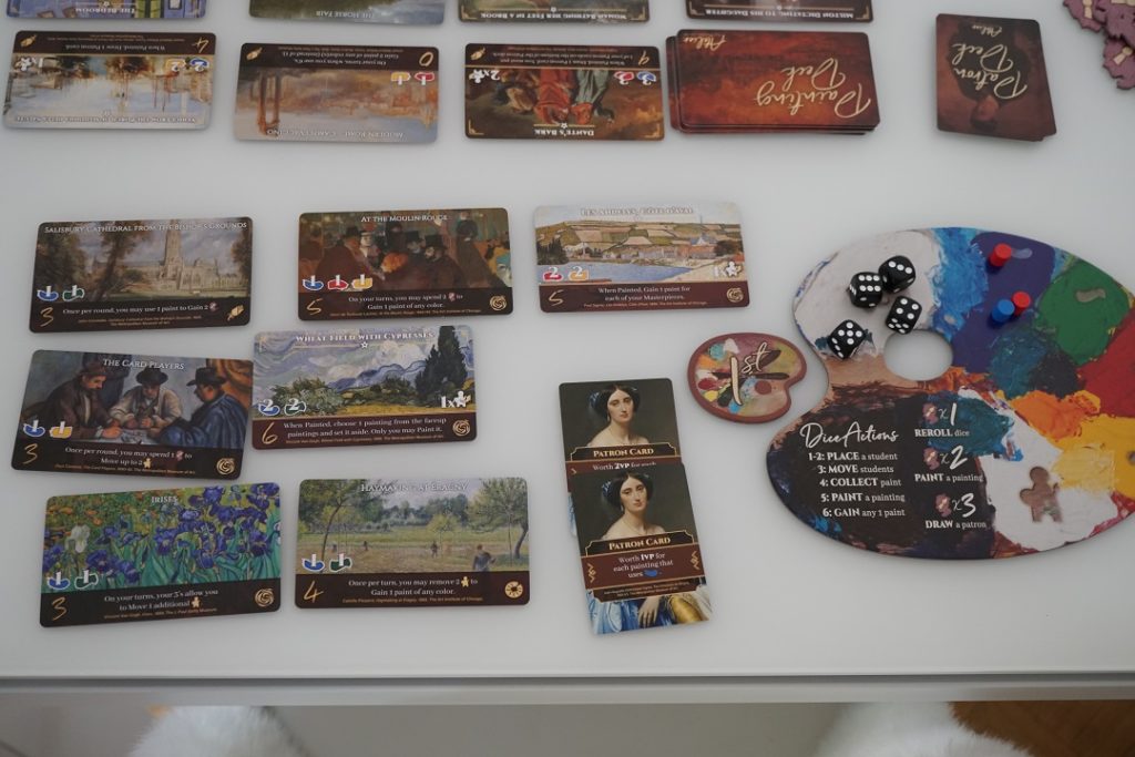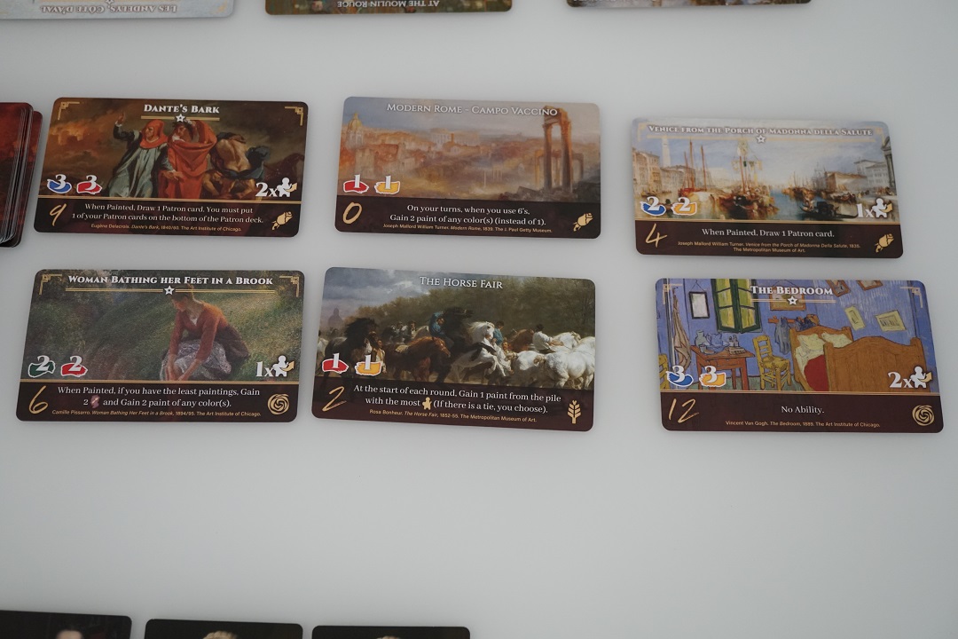 Avec les jetons inspiration vous allez pouvoir relancer vos dés, peindre une peinture ou prendre une carte patron qui vous apportera des PVs en fonction de certains critères (avoir autant d’étudiants à tel endroit, avoir peint autant de peintures de tel type,…).