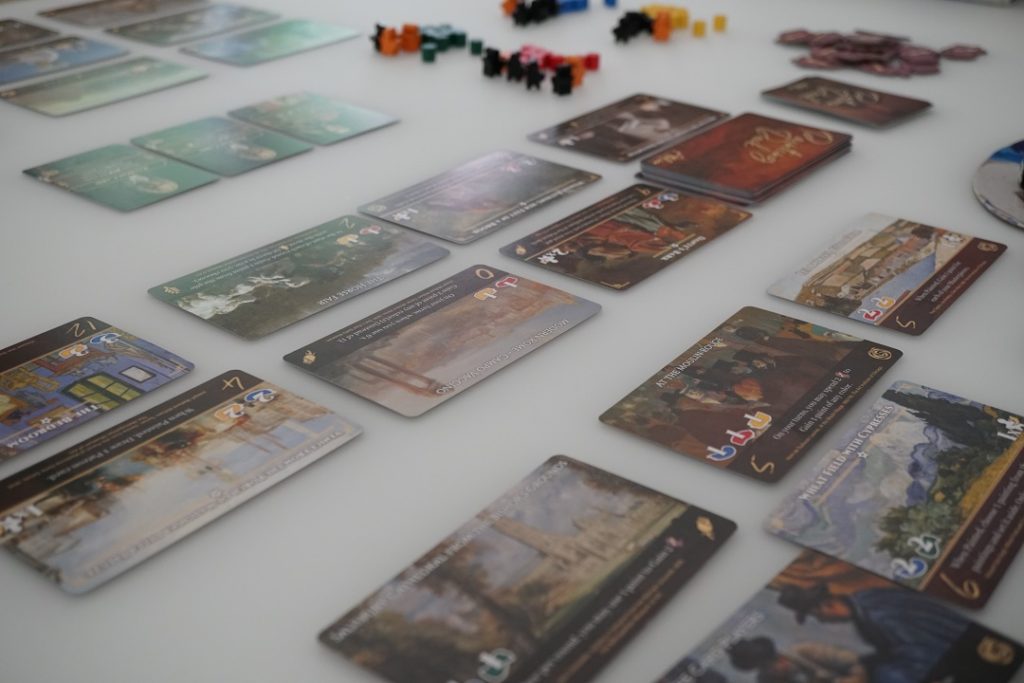 Une fois peintes, non seulement les peintures vous rapportent des PVs, mais elles vous apportent également des pouvoirs intéressants. Et c’est ça le plus sympa dans Atelier. Vous allez devoir bien choisir les peintures à peindre selon différents critères: les PVs qu’elles vous rapportent, les pouvoirs qu’elles vous donnent, les combinaisons possibles entre ces pouvoirs, les avantages que peuvent en retirer vos cartes objectifs et l’impact qu’elles ont sur la fin du jeu! Car oui, certaines peintures sont des pièces maitresse qui déclenchent la fin du jeu une fois qu’une joueuse en possède 3. Ce sont donc les joueuses qui vont influencer sur la fin du jeu. C’est très sympa comme mécanique mais cela peut, ici, bien rallonger la partie si personne ne veut en finir. Heureusement, un bonus de 4 PVs est donné à la joueuse mettant fin au jeu, de quoi inciter à terminer même si ce n’est pas déterminant.