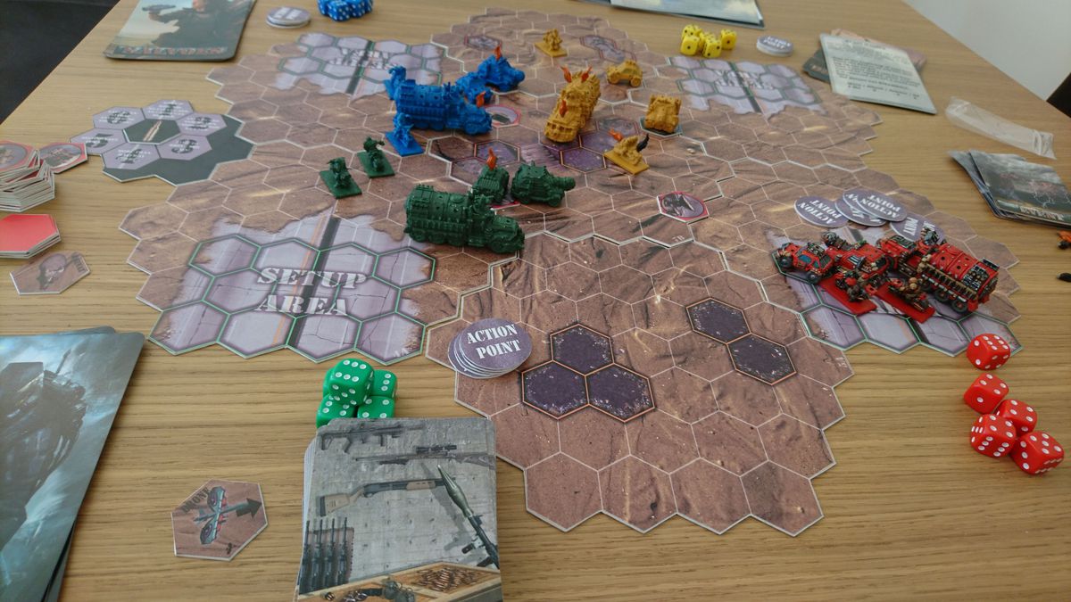 Le reste du jeu est d’ailleurs très classique et consiste à une bataille de territoires, chaque zone contrôlée rapportant un PV et celui en amassant suffisamment à la fin l’emporte. Ces jetons contrôle ne sont donnés que si vous arrivez à sécuriser la zone durant le tour du joueur qui vous suit. C’est assez sympa comme mécanique qui vous oblige à construire une bonne défense sans se contenter d’une simple attaque. Alors que les déplacements sont dictés par les capacités de chaque unité, les combats, eux, sont régis par les dés qui doivent être supérieurs à certaines limites fixées par chaque véhicule.