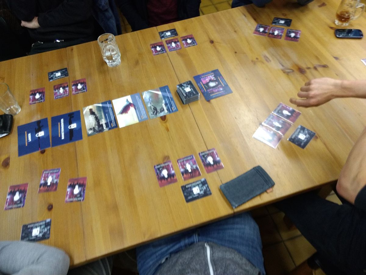 Contrairement aux Loups Garous où on va tous commencer dans le même camps des villageois, au début d’une partie d’Human Punishment, chaque joueur commence seul. Comme il y a 3 factions en jeu, personne ne sait qui appartient à quel camp et ça crée une ambiance fort suspicieuse 😉 A son tour, on a le choix entre investiguer ou tirer sur un adversaire (ou alliée 😉 ) afin de dévoiler son identité.