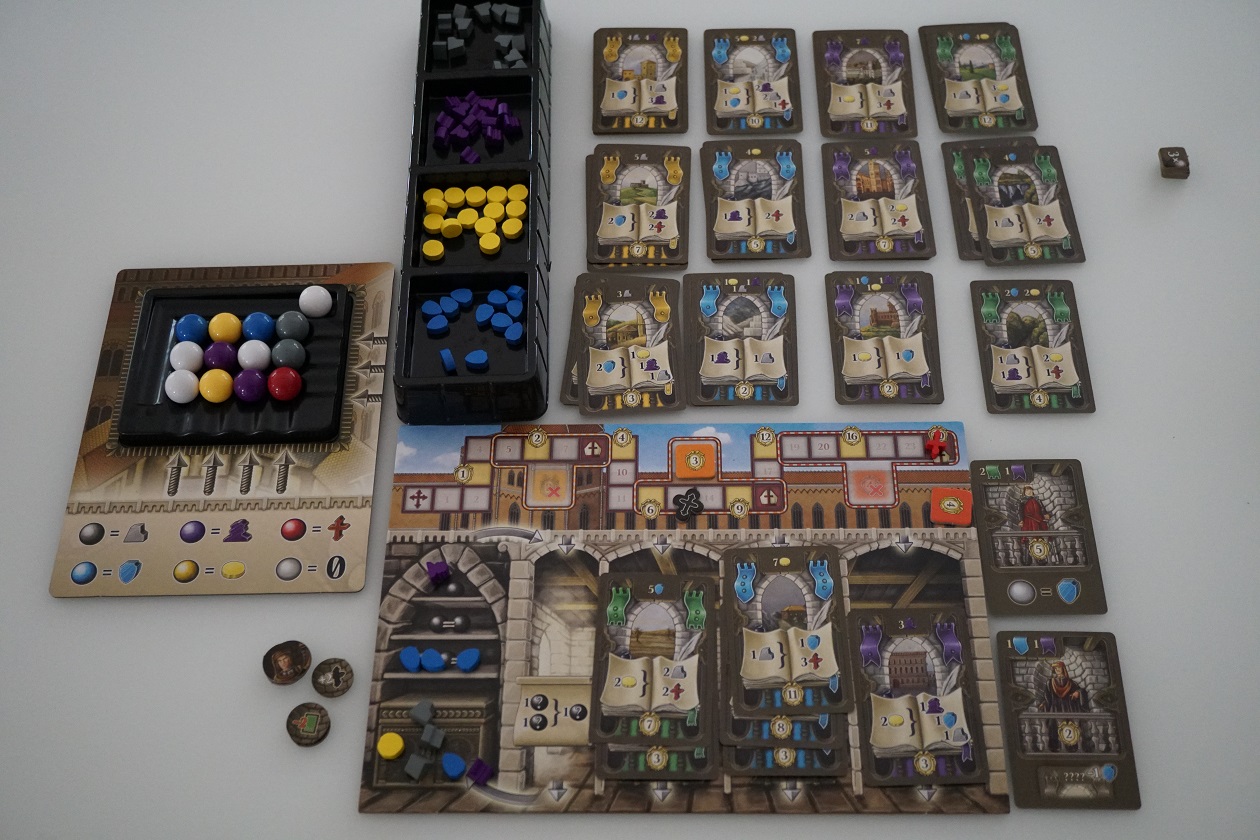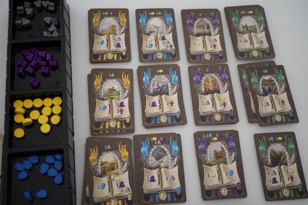 Le « plateau » de jeu est composé de 12 paquets de 4 cartes chacun répartis en 4 colonnes de couleur différente et 3 lignes correspondant aux 3 niveaux de cartes. A son tour on a le choix entre 3 actions. Le première consiste à prendre des ressources selon un système de billes assez original. On va prendre les ressources correspondant aux couleurs des billes d’une ligne ou d’une colonne puis, ajouter sur la ligne ou colonne choisie, la bille en surplus qui fera tomber une autre bille (si vous ne comprenez pas, regardez la vidéo ci-dessous, c’est mieux expliqué 😉 ). C’est assez orignal comme système même s’il peut être résumé à un système de choix de ressources comme un autre…