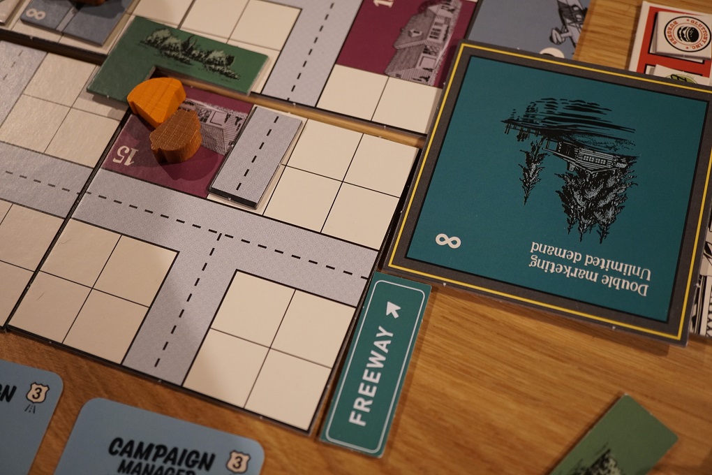 Etrangement, ce qui bouleverse le plus la partie sont les nouvelles tuiles. On n’a que trop peu profité de la zone rurale qui demande 2 ressources à chaque tour et n’a pas de limite en nombre de produits demandés. Même chose pour les lobbyistes qui permettent de construire des parcs doublant le prix à payer par les maisons adjacentes. Ces lobbyistes sont plus intéressants que les maisons avec jardin car ils ne doivent pas être formés pour pouvoir placer un parc, encore faut-il bien les placer… De plus, ils permettent également de construire des routes rendant accessibles des zones qui ne l’étaient pas et augmentant d’autant plus l’interaction avec les joueuses amatrices d’isolement 😉