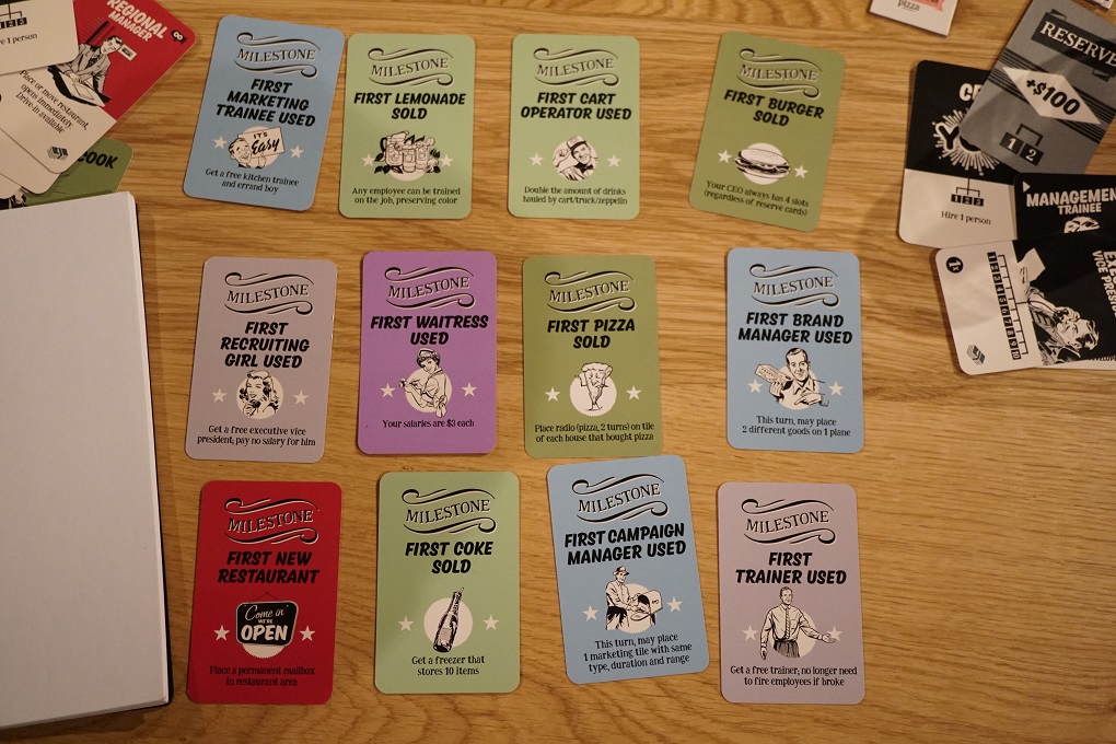 C’est un des modules les plus riches de cette extension. Basta les anciennes milestones, dorénavant, on utilise de toutes autres. Fini donc les départ stéréotypés du jeu de base et bienvenue à d’autres combinaisons intéressantes. Commencer par une campagne marketing va vous permettre d’engager gratuitement un errand boy et un cuisto ce qui donne un départ en trombe. Vendre une limonade en premier va vous permettre de former votre personnel même quand il est au travail. C’est très puissant et peut être même un peu trop. Le premier à engager une serveuse verra tous ses salaires réduits à 3$,… Pas mal de nouvelles possibilités donc qui vont changer fondamentalement vos parties et votre façon de jouer à cet excellent Food Chain Magnate.