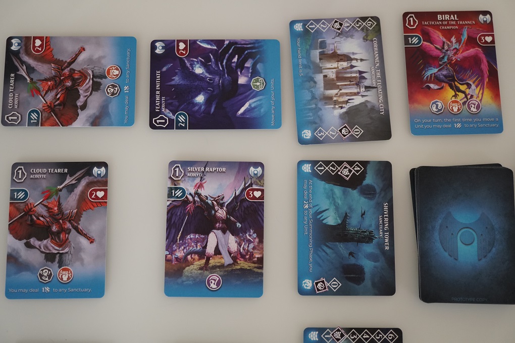 En début de partie, les deux joueurs vont disposer leur 4 cartes sanctuaires en ligne. Ces sanctuaires ont des points de vie, les Aegis, et présentent chacun un nombre de tours nécessaire pour être activés. A chaque tour, on va augmenter d’un cran le compteur de tours et quand celui-ci arrive à 0, l’effet du sanctuaire devient actif pour le reste de la partie. Ces effets sont très divers, j’y reviens dans l’explication des decks, et, généralement, très puissants.