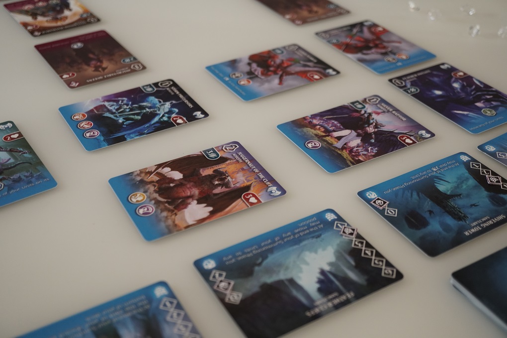 Nous avons reçu un prototype du jeu qui n’inclut pas encore le mode solo nous n’avons donc pas pu jouer à ce mode. Qui dit prototype dit matériel non fini, je ne vais donc pas m’appesantir sur le matériel du jeu si ce n’est sur 3 éléments. D’abord les illustrations, elles sont magnifiques ! Et non seulement elles sont belles, mais en plus elles sont nombreuses. Un deck comporte 33 cartes dont 19 sont uniques (et 14 sont en double). Le proto que j’ai reçu comportant 6 decks différents, vous obtenez donc 114 cartes différentes aux illustrations uniques et magnifiques. De plus, la qualité des cartes du proto est bluffante. C’est simple, je n’ai jamais vu des cartes d’une telle qualité : épaisses, rigides, ayant un effet mat,… Enfin, un tout petit mot sur les jetons d’indication. Certaines cartes, les sanctuaires, ont 2 jauges à suivre : leurs points de vie et leur jauge d’activation. On va donc placer 2 minuscules jetons sur chacune de ces cartes pour pouvoir suivre l’état de leur 2 échelles. Dans le proto que j’ai reçu, ces jetons étant en carton, ils étaient très difficile à manipuler et perdaient leur place dès qu’on bougeait un peu la carte sur laquelle ils étaient ne fut-ce que pour en lire leur effet. Bref, tout ça n’était pas très ergonomique et je suis très curieux de voir ce qu’ils vont proposer sur la page KS pour améliorer cette manipulation.